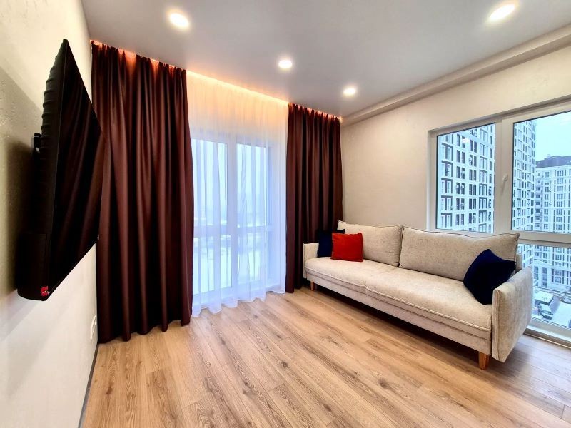 Продаж 1-к квартири вул. Зарічна 2. Найвидовіша квартира в ЖК Славутич. В квартирі зроблено дизайнерський ремонт, є вся необхідна побутова техніка: посудомийка, вбудований холодильник, сенсорна витяжка, варочна поверхня, мікрохвильовка, духовка, пральна машинка з функцією осушки, кондиціонер, телевізори, душ, ванна, інсталяція, парящя стеля, паряще ліжко, декоративна оздоблення стін-штукатурка В ЖК цілодобова охорона на камери відеоспостереження. 044 200 10 80