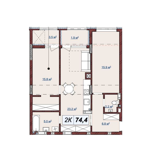 2-кімнатна квартира 74,4 м² з просторою кухнею-вітальнею.