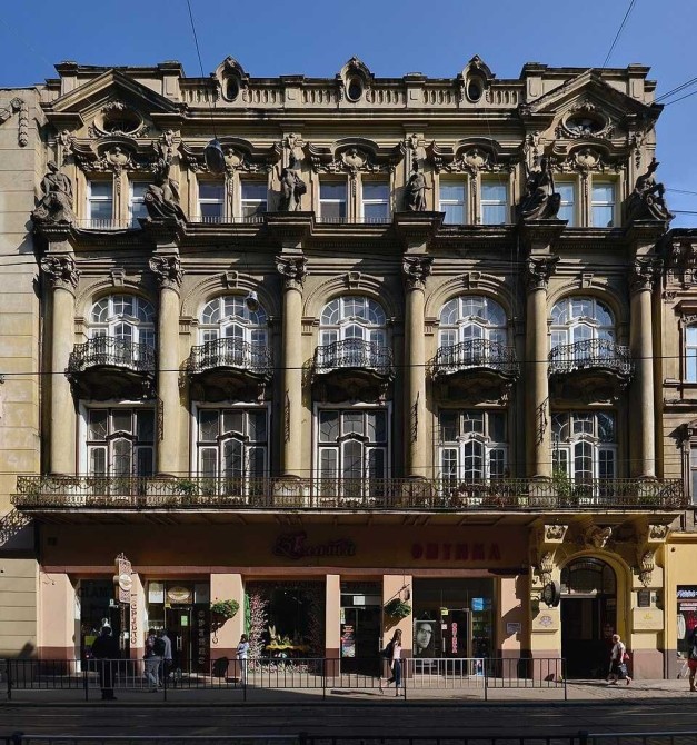 Попередній будинок на цьому місці був споруджений 1888 року за проектом Якуба Кроха, та нову триповерхову кам'яницю розібрали, для майданчика під будівництво нового будинку. Нову кам'яницю зведено 1909 року за проектом архітектора Володимира Підгородецького, для банкіра Едварда Ландау. Скульптор Петро Війтович, виконав на фасаді будинку шість скульптур. Це алегоричні зображення «Війни», «Миру», «Науки», «Мистецтва», «Праці» і «Торгівлі».