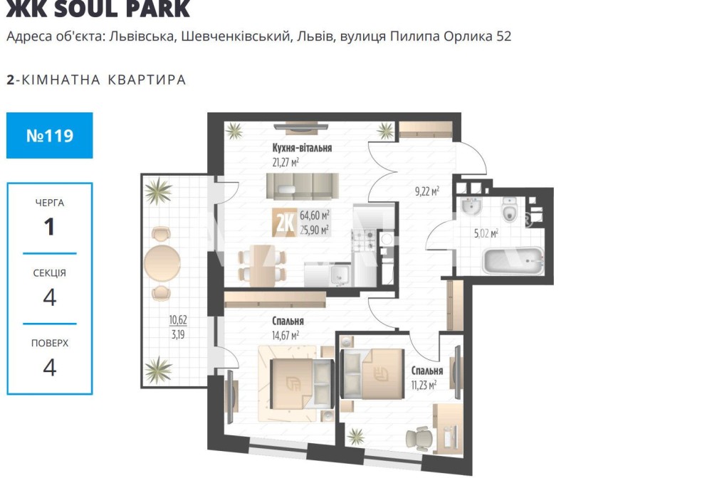 ЖК Soul Park, вул. П. Орлика - 2-кімнатна з видом на місто, 1 черга