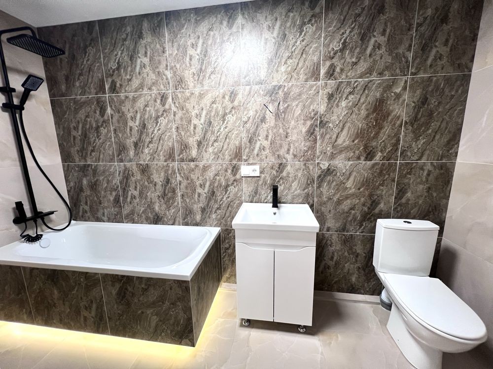 Вже встановлені найважливіші зони кухня та санвузол, також є двохспальне ліжко. Дуже вигідна ціна для тих, хто планує поступово наповнювати квартиру чи підбирати меблі під свій смак.