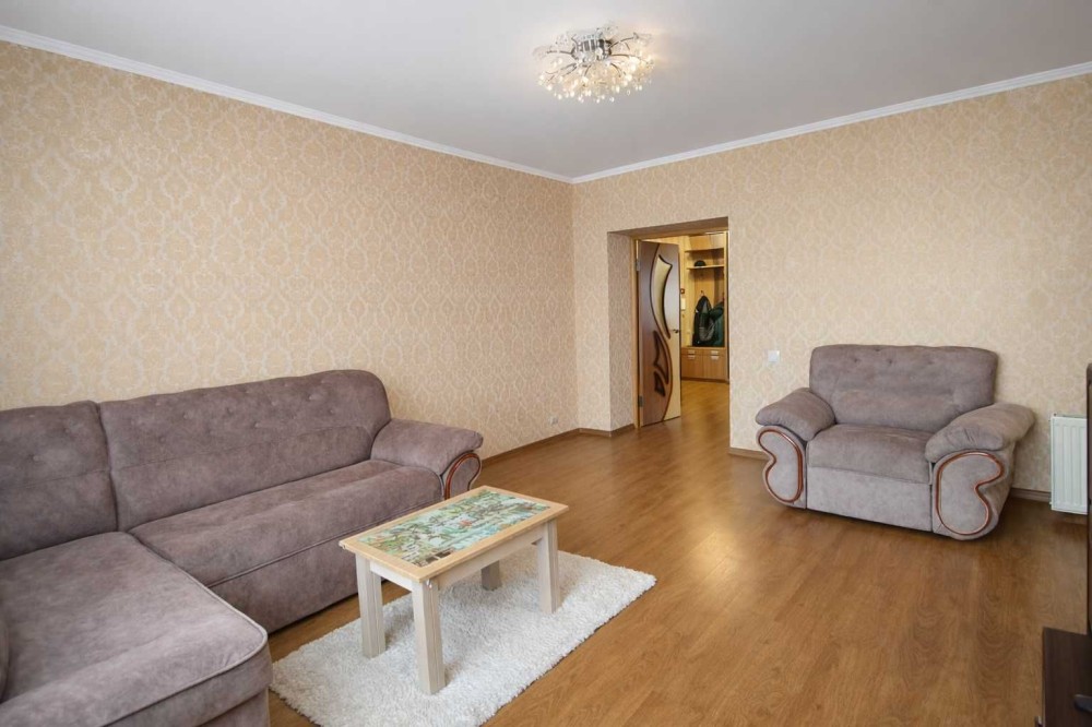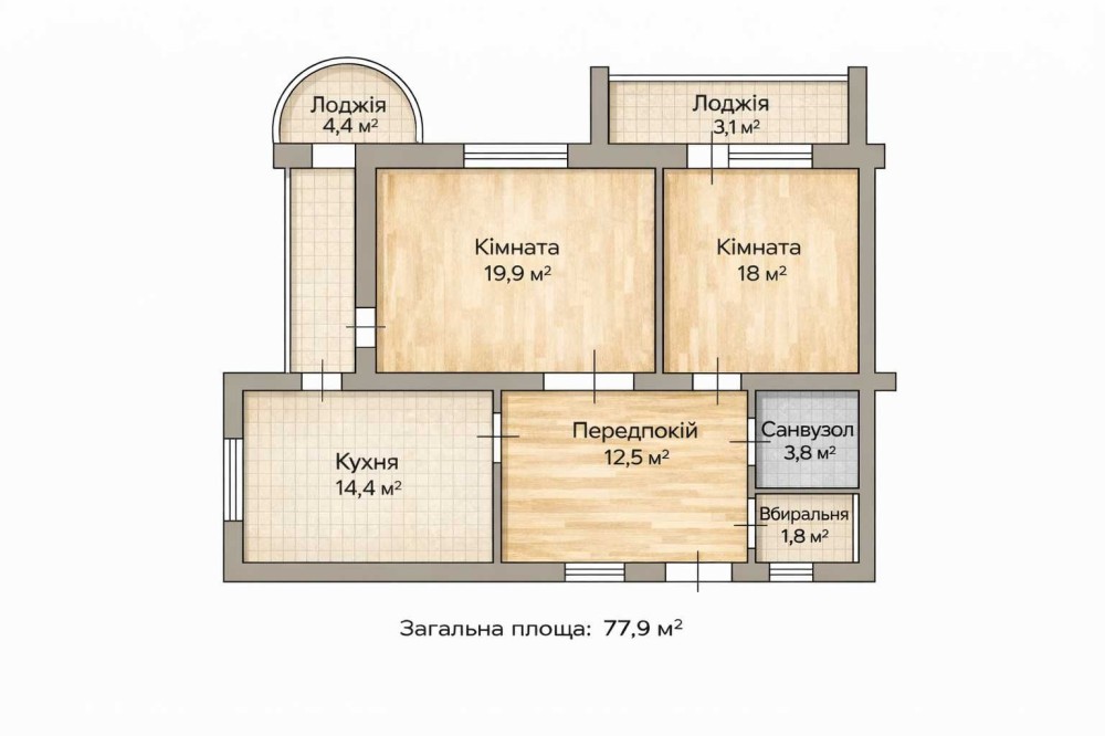 Квартира має вдале планування та велику площу — 77,9 м², житлова площа становить 37,9 м². Дві окремі непрохідні кімнати, простора кухня площею 14,4 м², великий передпокій і дві лоджії з гарним панорамним видом на місто роблять житло зручним і комфортним для щоденного проживання. Квартира дуже світла й тепла, з приємною атмосферою та відчуттям простору.