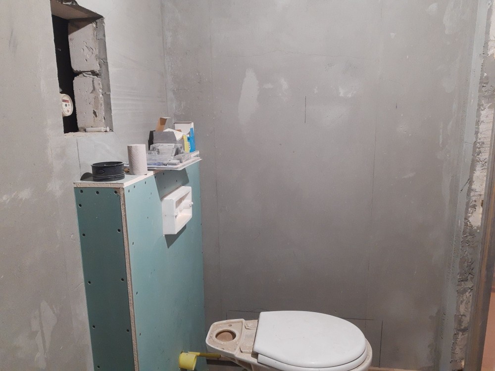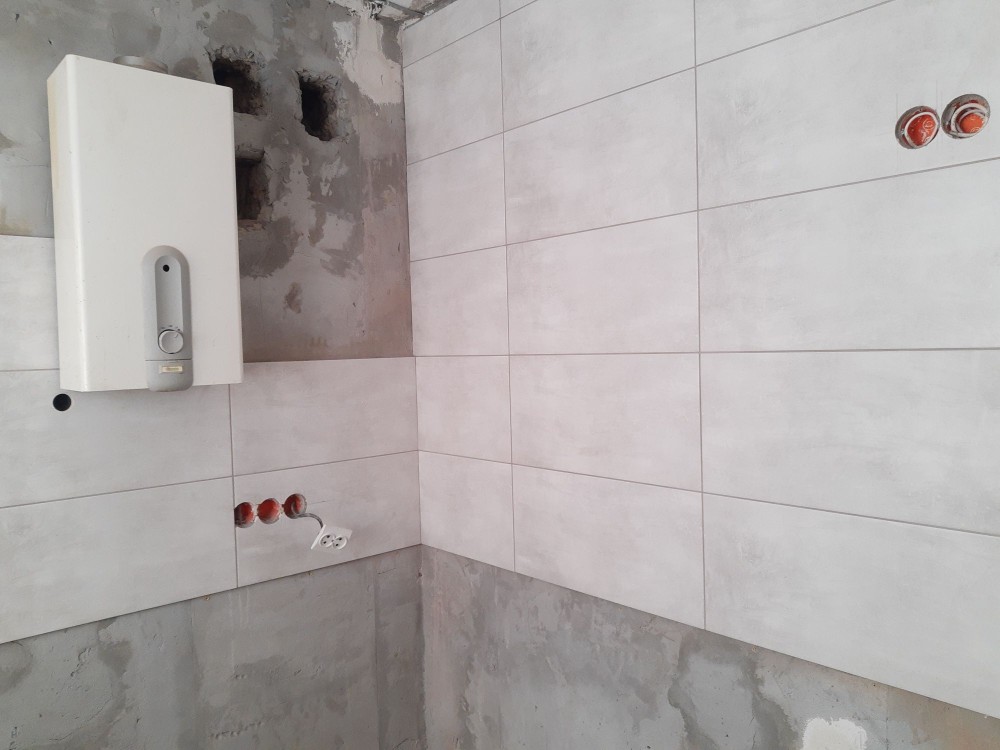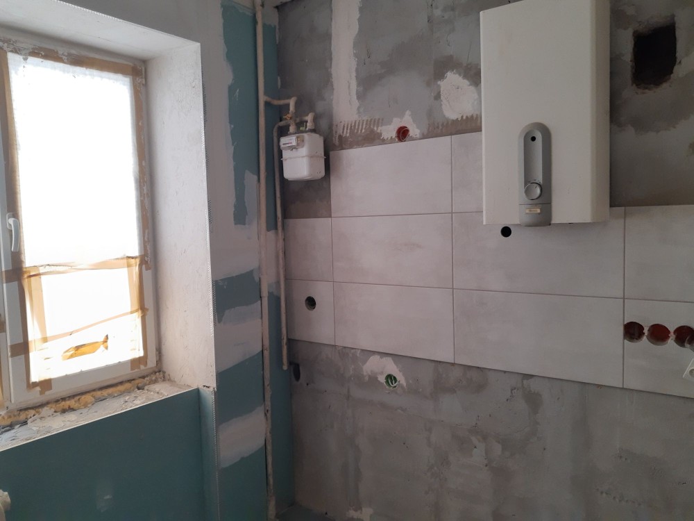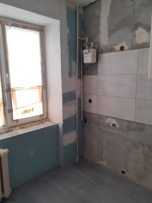 Кухня- стяжка, покладена нова плитка на підлозі та на стіні.