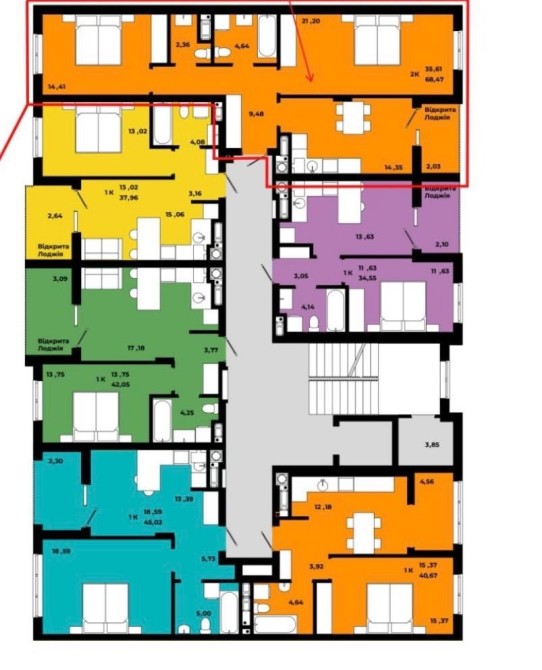Квартира розташована на 5 поверсі з 6. Загальна площа — 68,47 м². Зручне та продумане планування: простора кухня-вітальня, дві окремі кімнати, санвузол та відкриті лоджії. Вікна виходять на східну та західну сторони, що забезпечує гарне природне освітлення протягом усього дня.