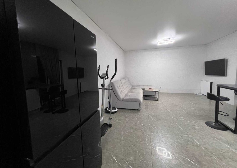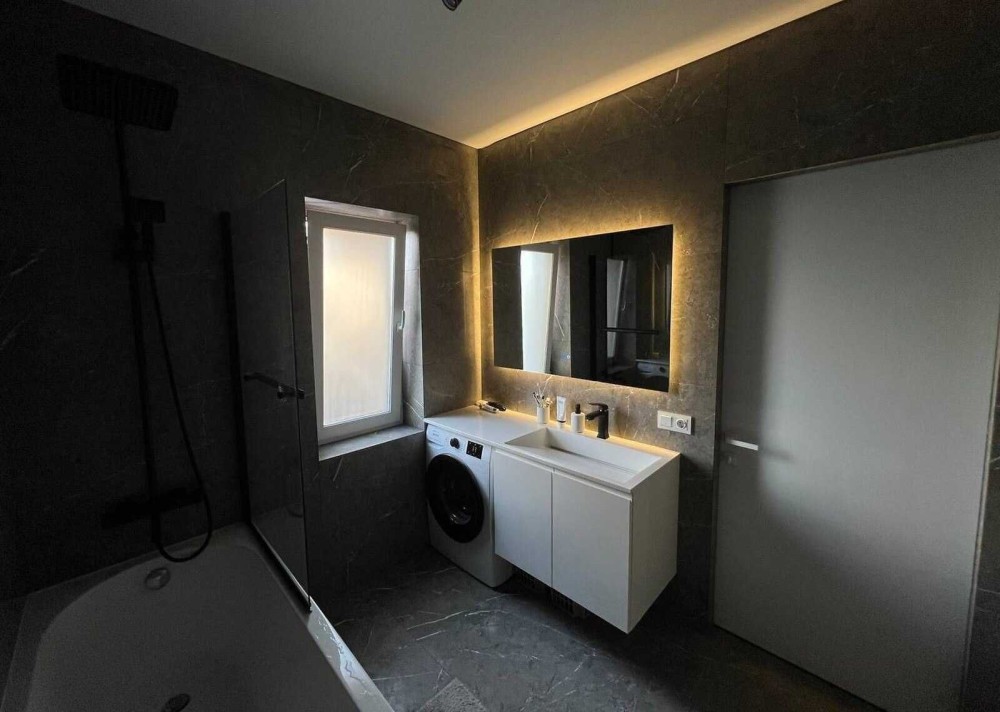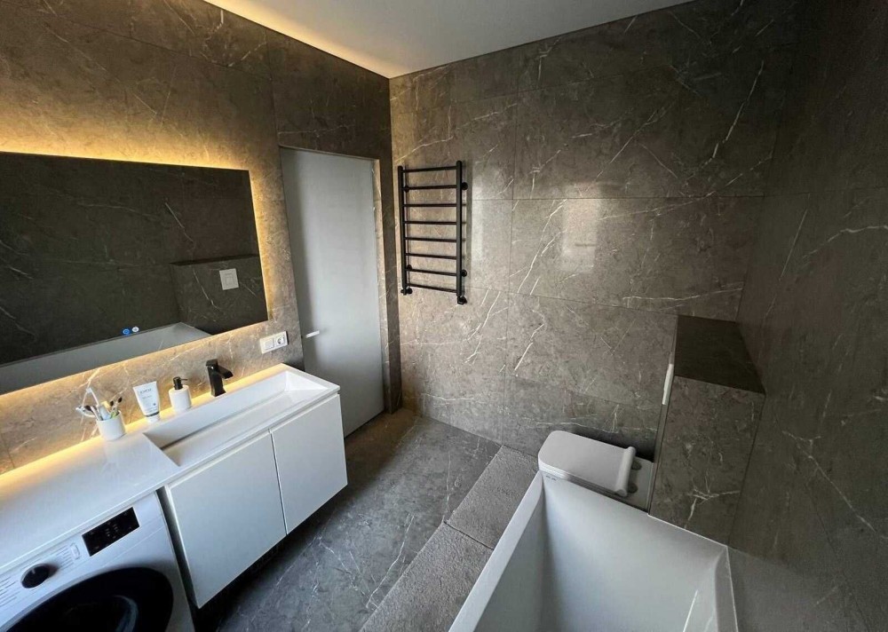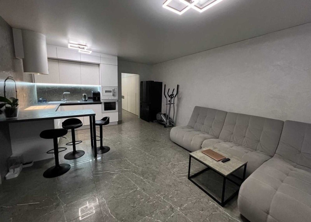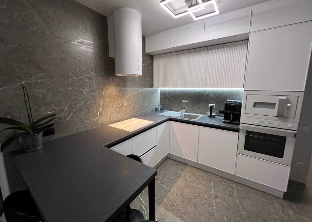 Техніка: холодильник Hisense з чорного скла трикамерний (холодильна + дві морозильні камери). Варочна панель, духовий шкаф, микрохвильовка - Gоrenje серія Ora-ito, посудомийка, пральна машина, електрочайник - Gоrenje, кавоварка - Siemens, витяжка - Elica Tube.