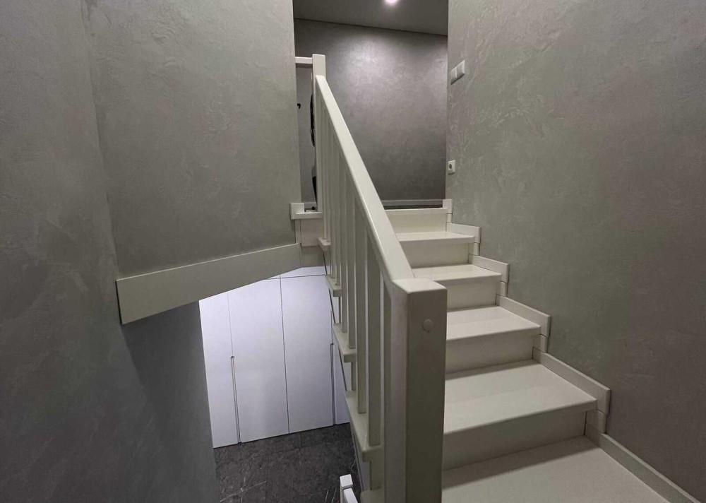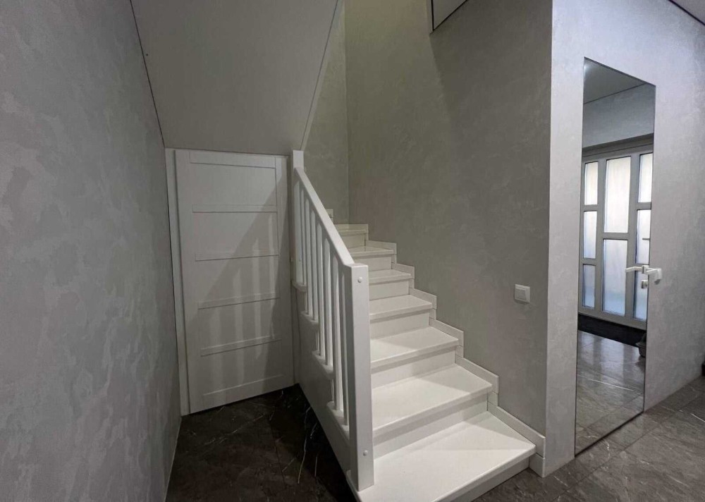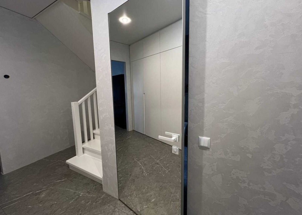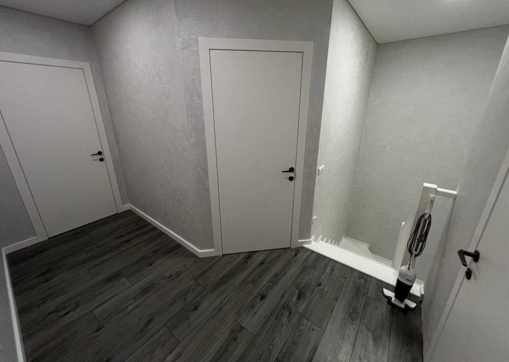По всій підлозі першого поверху, також на стінах в санвузлі і кухні - дорогий італійський нековзний керамограніт 120х60 см (одночасно полірований і шероховатий - НЕ слизький, див. останні фото) , на другому поверсі - ламінат, стіни - декоративна штукатурка