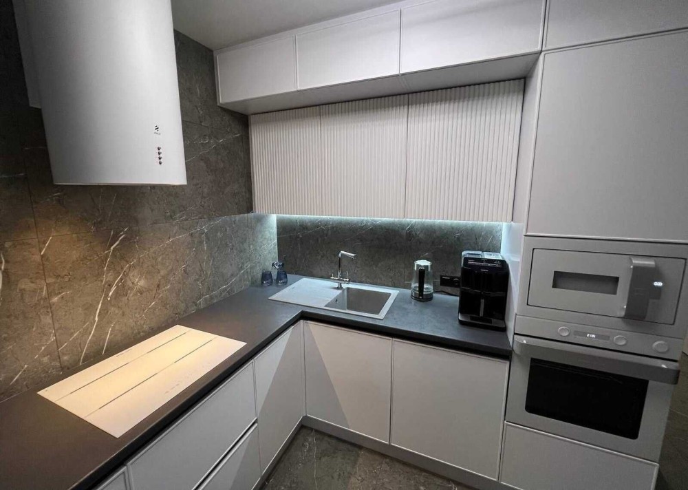 Меблі в кухню і коридор робились під замовлення по індивідуальному проекту, фасади - крашений матовий мдф, якісна фурнітура