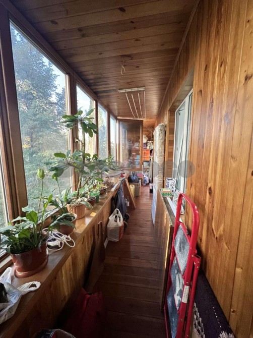 Планування з роздільними кімнатами та великою лоджією площею 6 м², яка проходить уздовж кухні та кімнати. Лоджія утеплена вагонкою, що дозволяє зберігати тепло взимку та підтримувати комфортну прохолоду влітку.