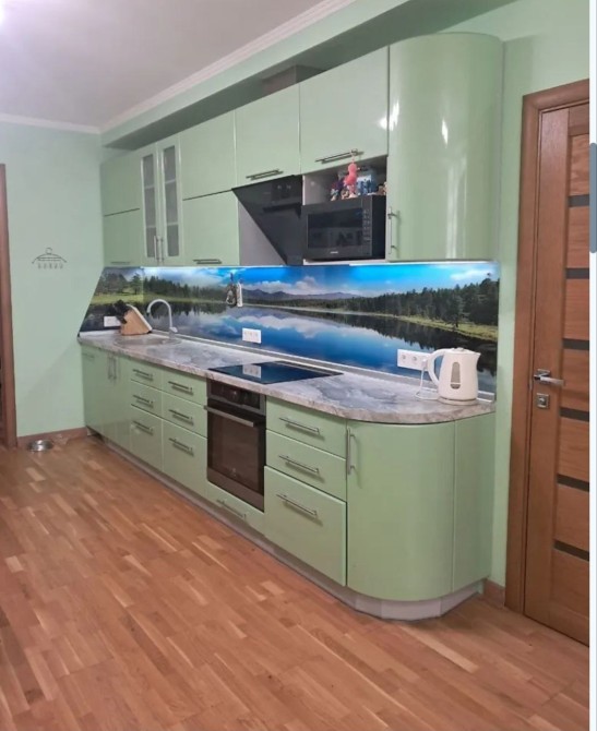 У кухні-студії виконано звукоізоляцію, стеля — гіпсокартон із додатковою шумоізоляцією. Кухонні меблі виготовлені за індивідуальним проєктом, робоча поверхня зі скляним фартухом (скіналі). Встановлена вбудована техніка: духова шафа, індукційна варильна поверхня, посудомийна машина, витяжка, облаштована лаунж-зона.