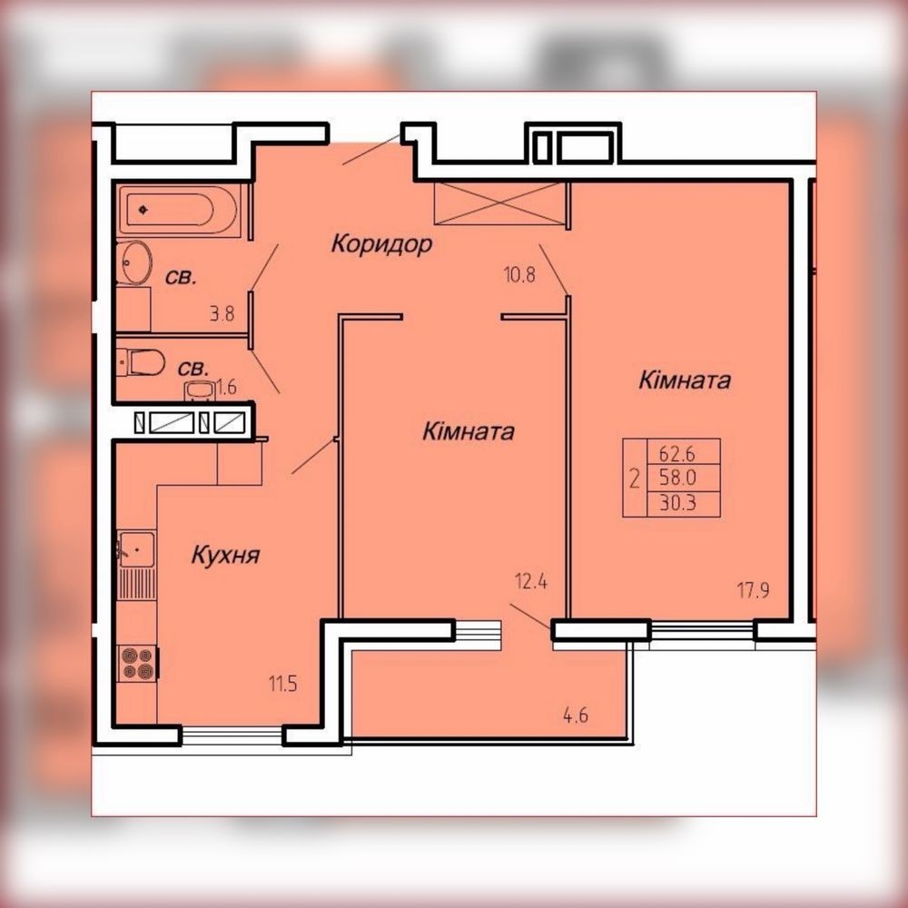 Квартира розташована на 16 поверсі 17-поверхового будинку. Загальна площа — 62,6 м². Вдале планування забезпечує комфортне використання простору: окрема кухня площею 11,5 м², дві ізольовані кімнати 12,4 м² та 17,9 м², просторий коридор 10,8 м², роздільний санвузол та лоджія 4,6 м².