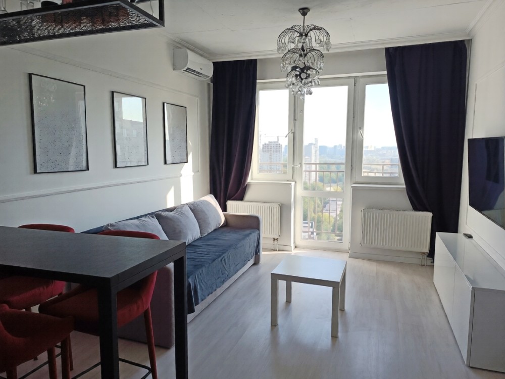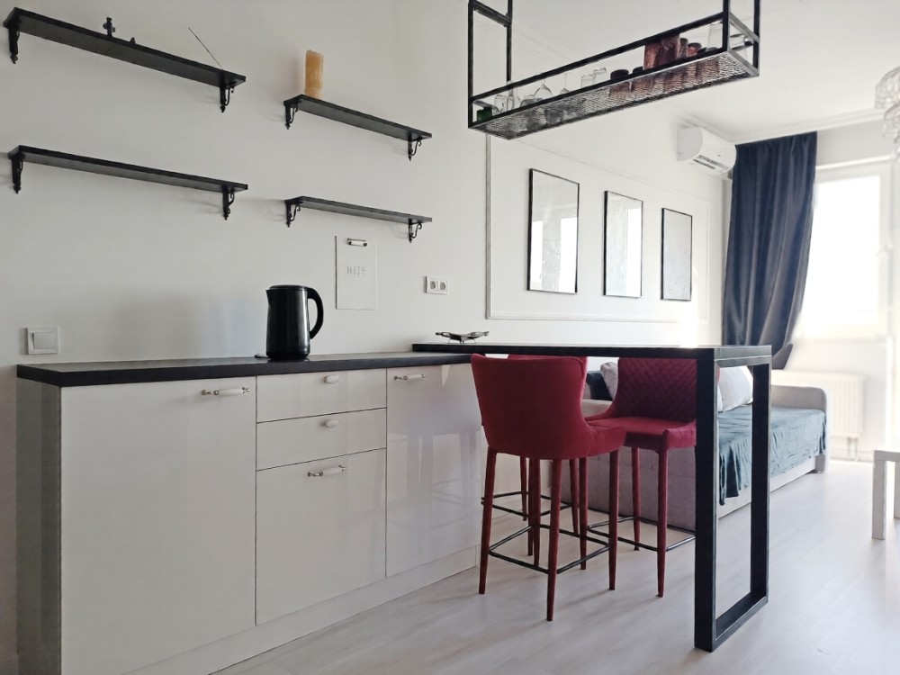 Кухня-студія повністю обладнана всією необхідною побутовою технікою – холодильник, індукційна варильна поверхня, духова шафа, витяжка. Зона відпочинку з диваном, TV та виходом на балкон.