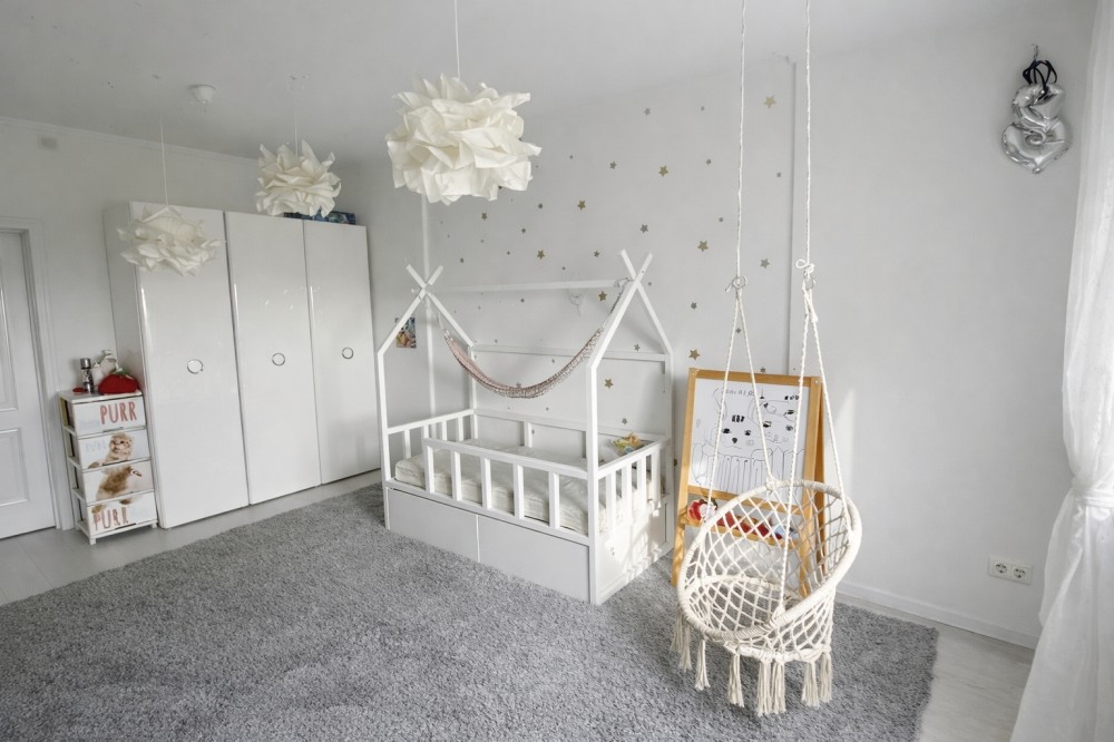 Дитяча кімната простора, розділена на логічні зони: для навчання, творчості та активних ігор. Родзинка інтер'єру — підвісне крісло.