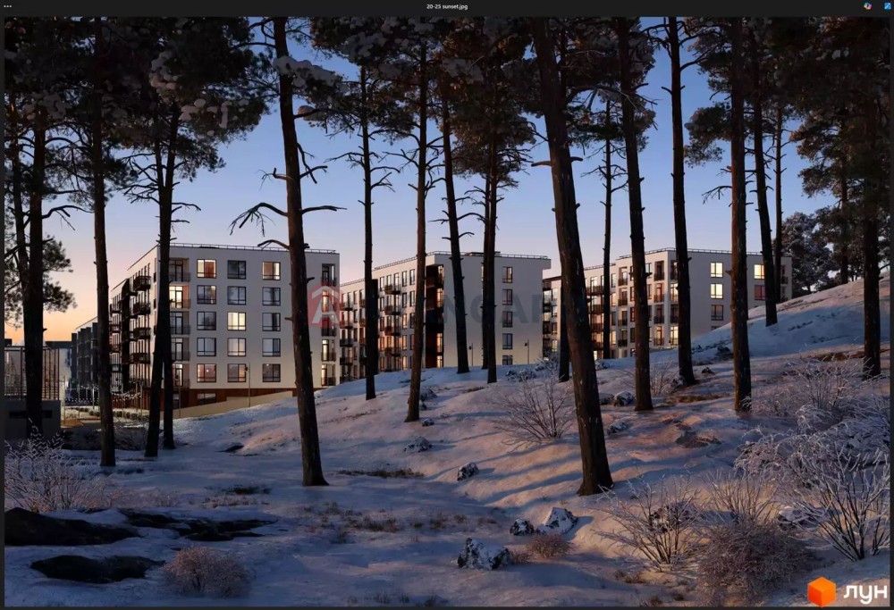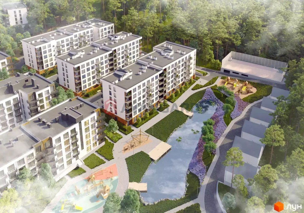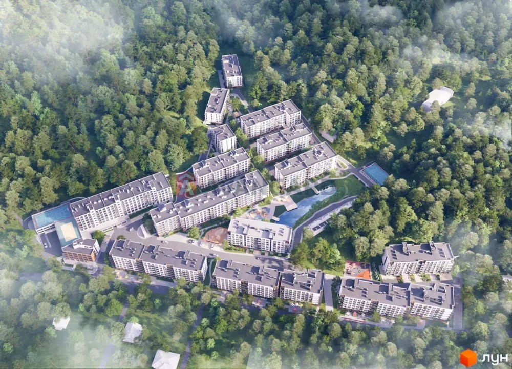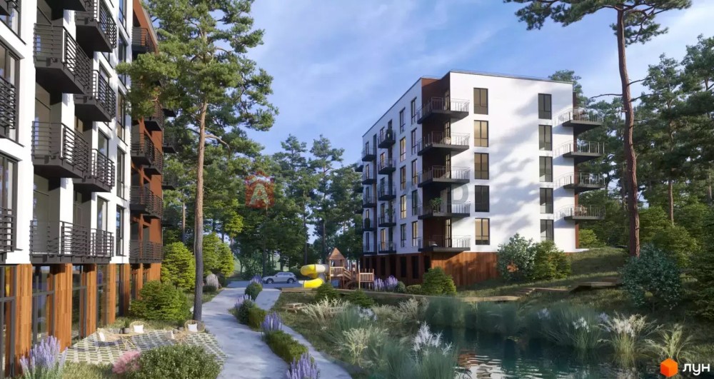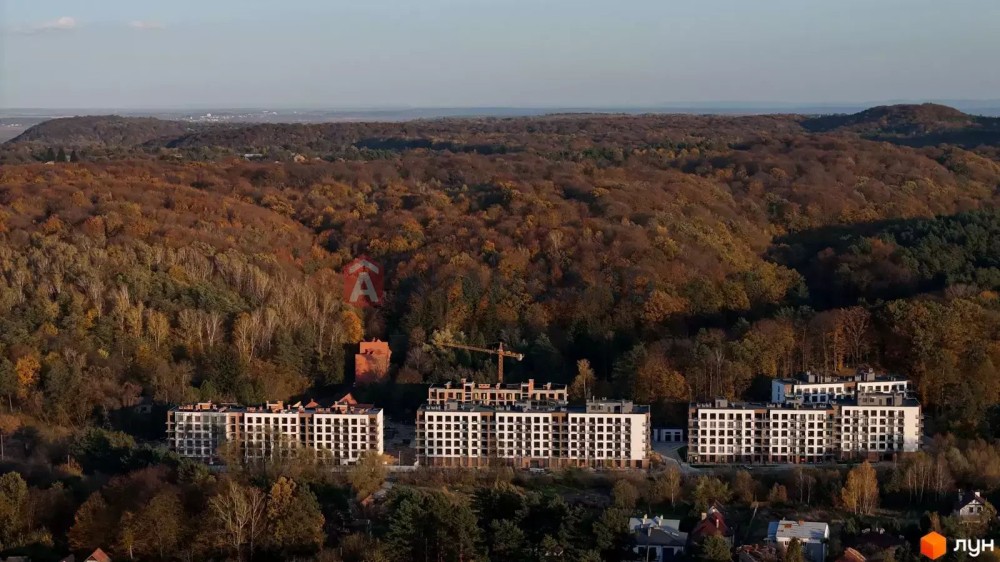Комплекс розташований у санаторно-курортній зоні Брюховичів, поруч із сосновим лісом та озерами - ідеальне поєднання тиші, природи та близькості до Львова (20 хв до центру).