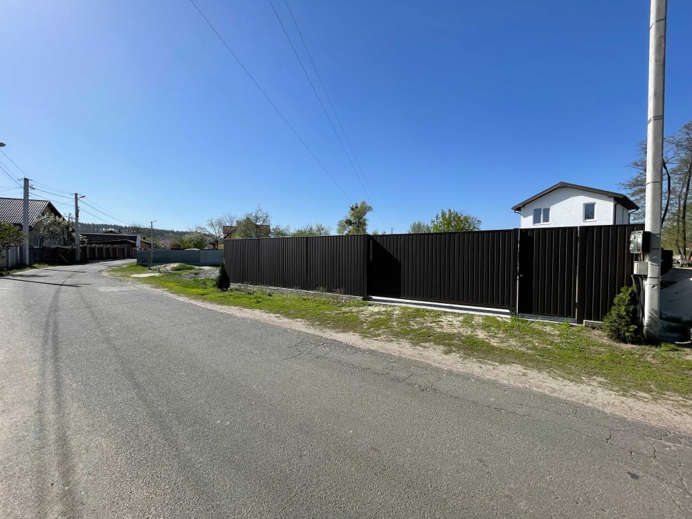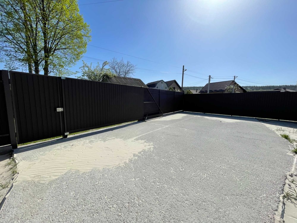 Встановлений паркан з металопрофілю по периметру ділянки з відкатними воротами на в’їзді (зроблено закладні під автоматику).