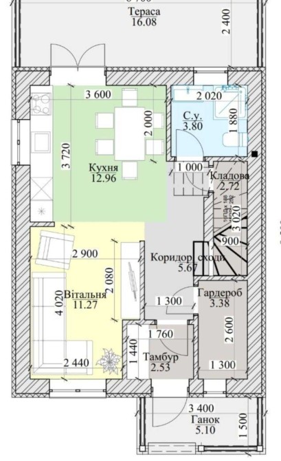 1 поверх - передпокій, топкова, санвузол, бетонні сходи на 2й поверх, простора кухня поєднана із залом та виходом на терасу.