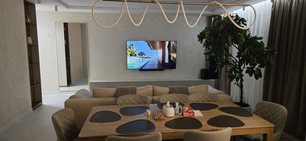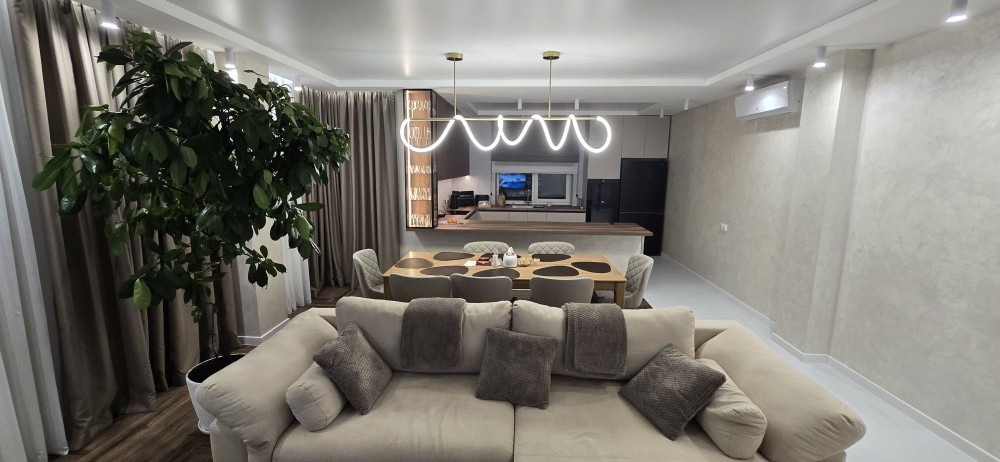Світла кухня-вітальня з м’якою зоною, стильним освітленням і великим обіднім столом — ідеальне місце для відпочинку та прийому гостей. Всі меблі та техніка гармонійно підібрані та залишаються новим власникам.