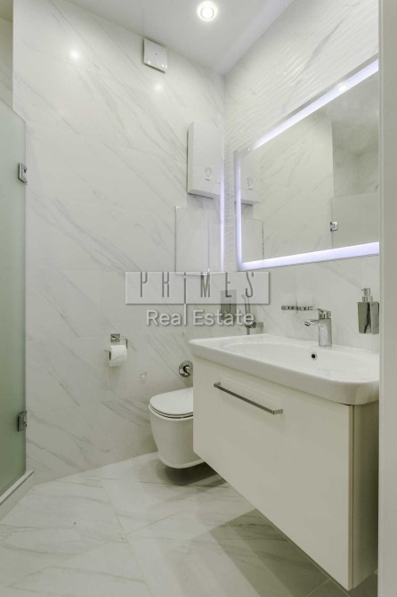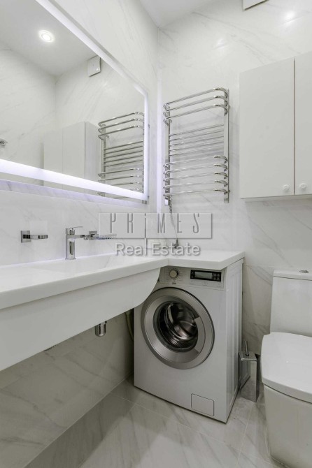 Квартира виконана у сучасному стилі з використанням якісних матеріалів, продуманих систем зберігання та акцентом на функціональність.