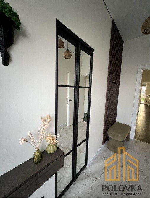 Будинок оснащений системою опалення (газове та електричне), теплими підлогами по всій площі, власною свердловиною, біосептиком та потужністю електропостачання 25 кВт. Планування включає три окремі кімнати, гардеробну, котельню, велику ванну кімнату з душем, гостьовий туалет, простору гостьову зону з кухнею та панорамними вікнами.