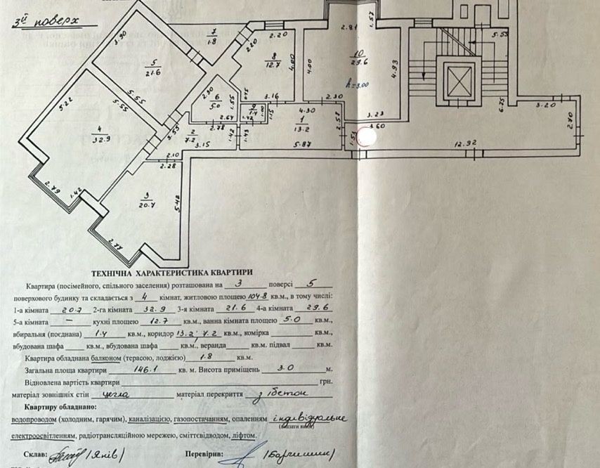 — загальна площа 146,1 м2, кімнати 20,7 м2; 32,9 м2; 21,6 м2;29,6 м2, кухня 12,7 м2
