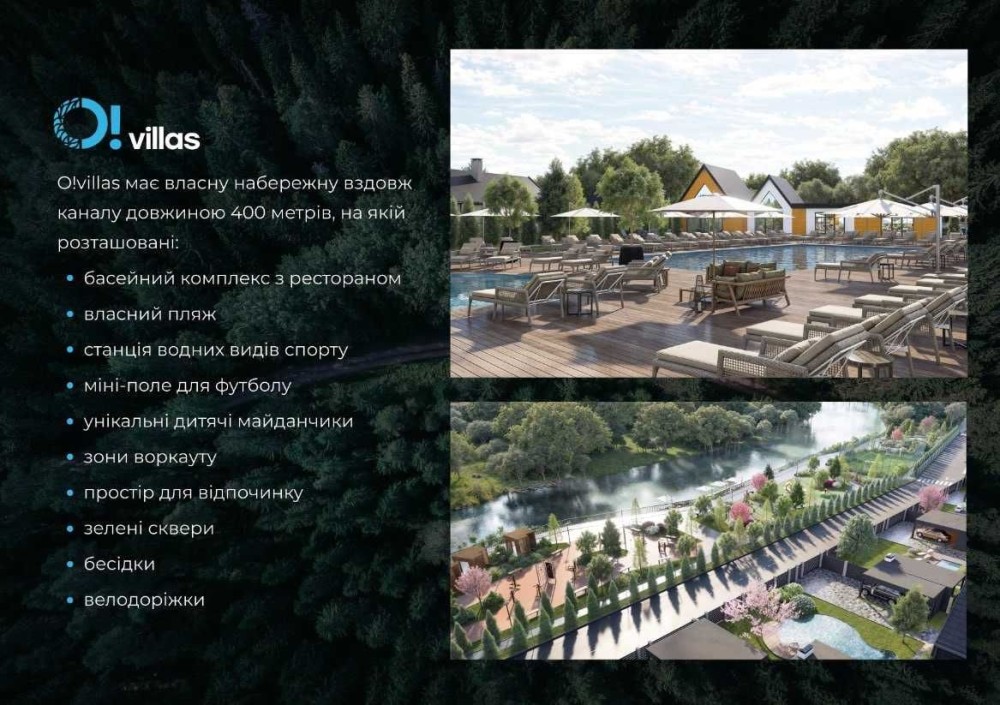 Життя на природі біля води сповнене особливою енергією! Котеджне містечко O!villas має власну набережну вздовж каналу довжиною 400 метрів, на якій розташовані: басейний комплекс з рестораном, власний пляж, станція водних видів спорту, міні-поле для футболу, унікальні дитячі майданчики, зони воркауту, простір для відпочинку, зелені сквери, бесідки, велодоріжки.