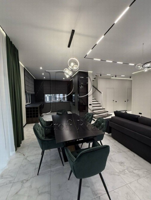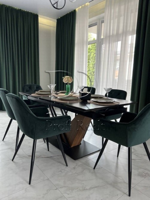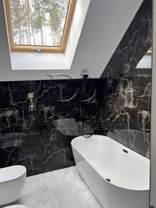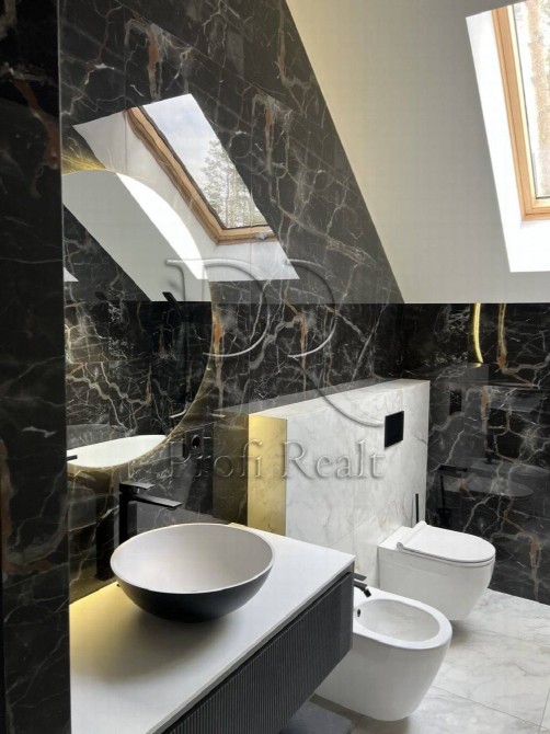 Всередині все продумано до дрібниць: спальні з м’якими геометричними панелями та прихованим підсвітленням, хол з високими стелями та підсвітленими сходами. Ванна кімната — як арт‑об’єкт: чорний мармур з золотими прожилками, вільностояча ванна під мансардними вікнами й вигляд на сосни. Їдальня з смарагдовими кріслами та сучасною кухнею — для тих, хто цінує не тільки смак, а й естетику застілля.