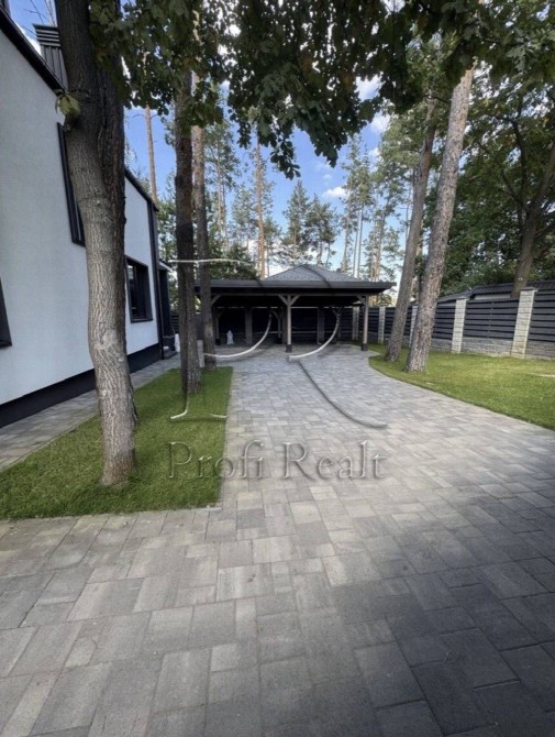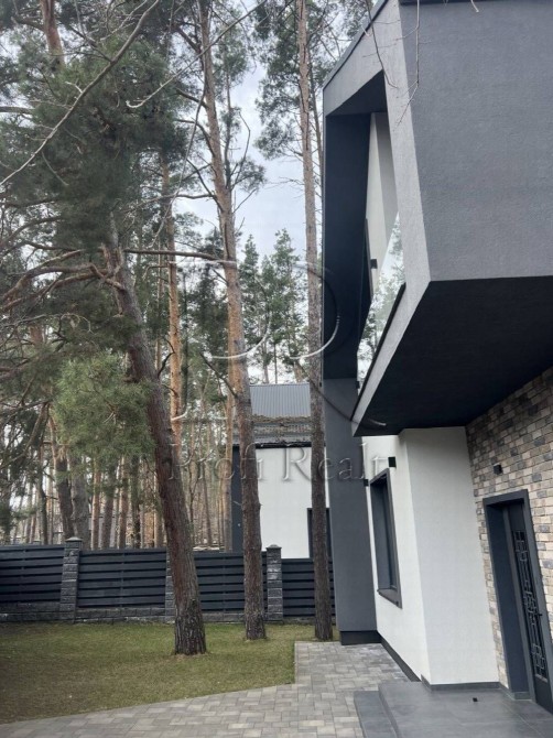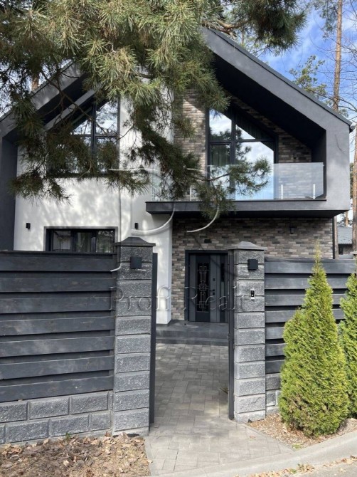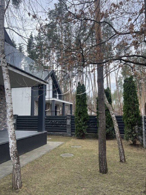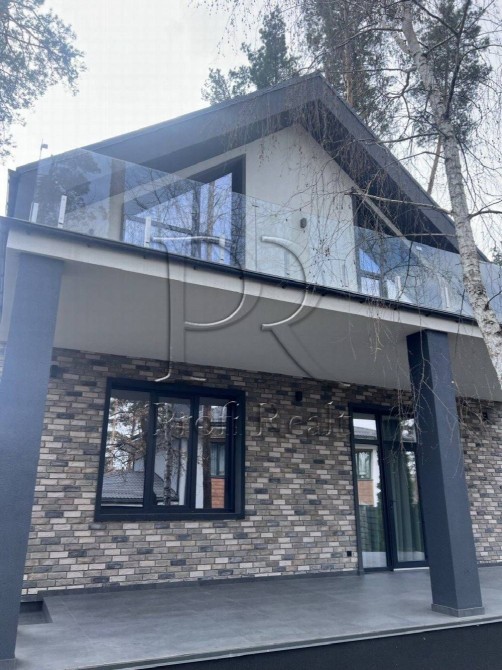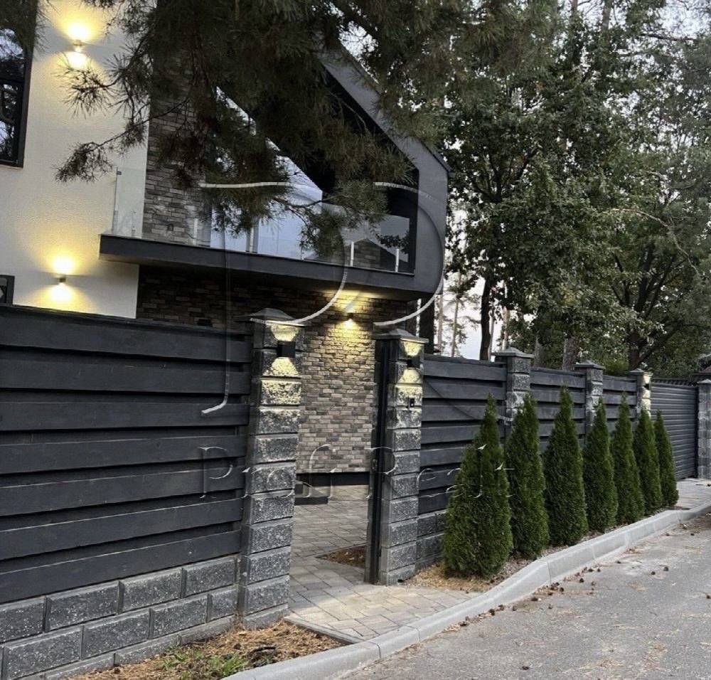 Будинок-мрія для тих, хто звик до рівня “лакшері”, але втомився від кліше. Знаходиться в “Беверлі‑Гілз” Ходосівки — район, де сосни високі, огорожі темні, а сусіди вітаються за руку. Архітектура – сучасний мінімалізм: скляний балкон, великі панорамні вікна й асиметричний дах. За парканом — власний ліс.