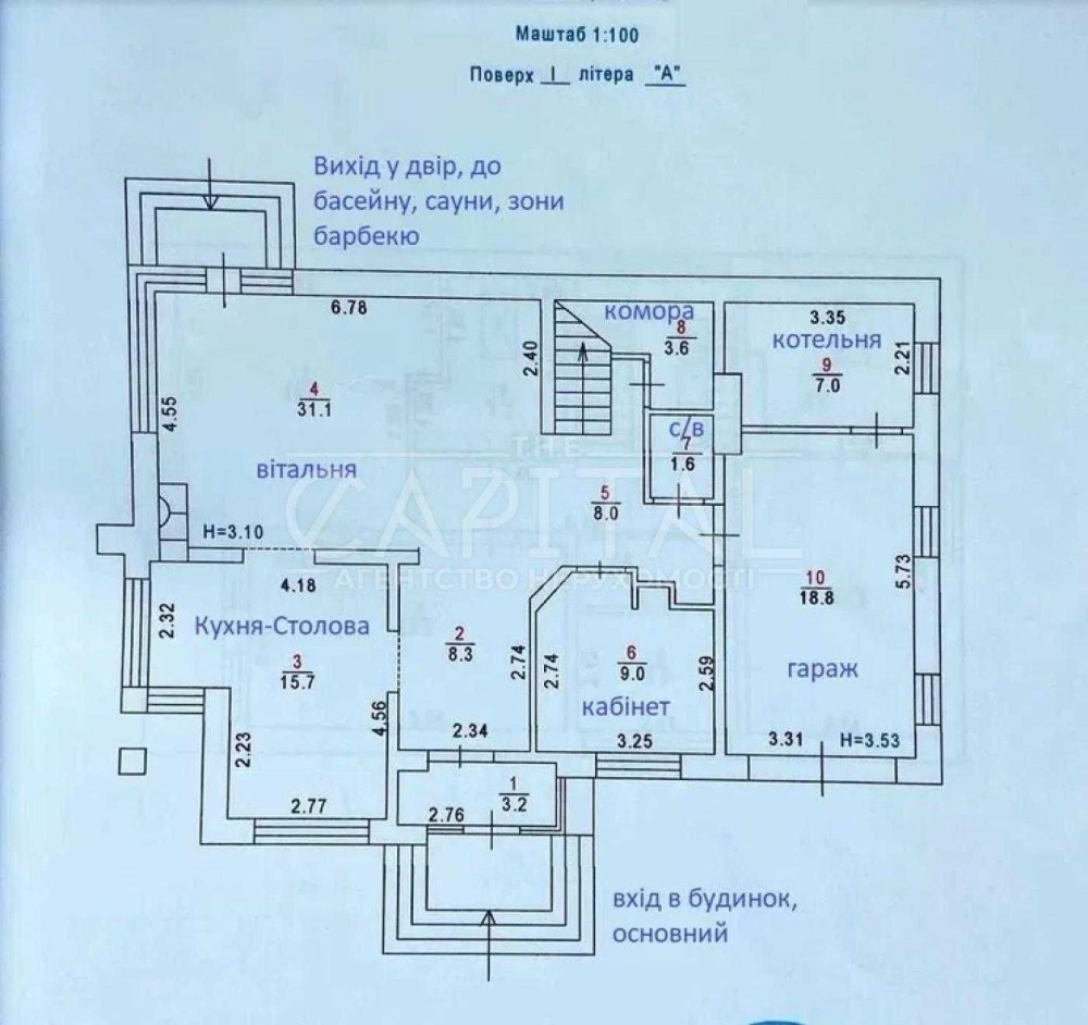 Перший поверх: кухня- вітальня, гостьова спальня, санвузол, гардероб, гараж, 2 підсобних приміщення.