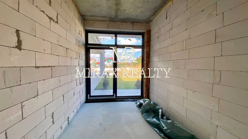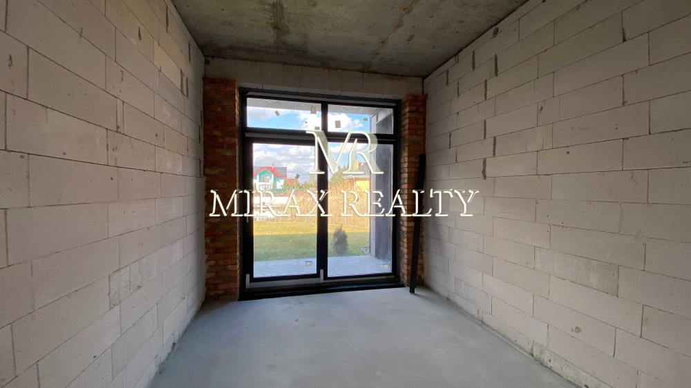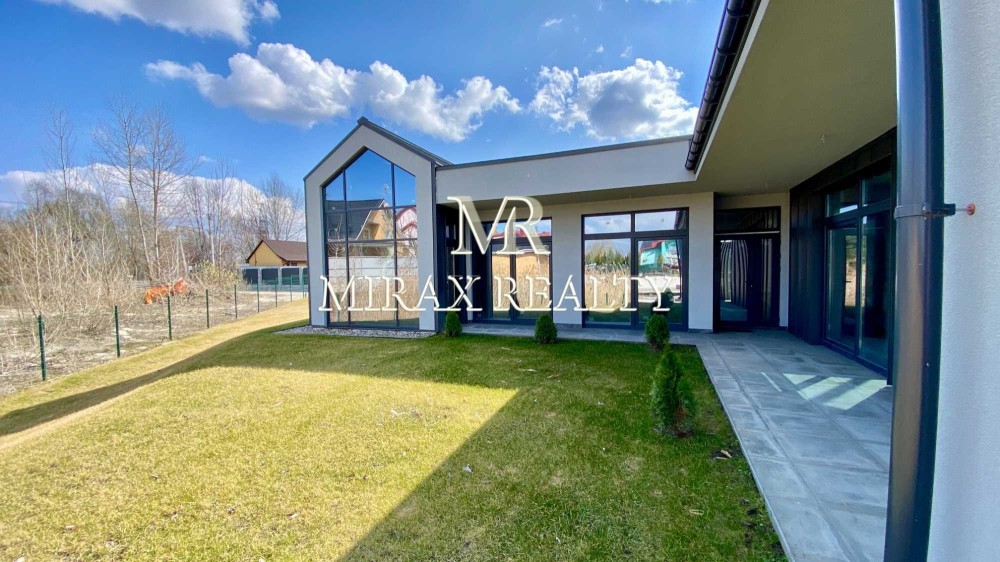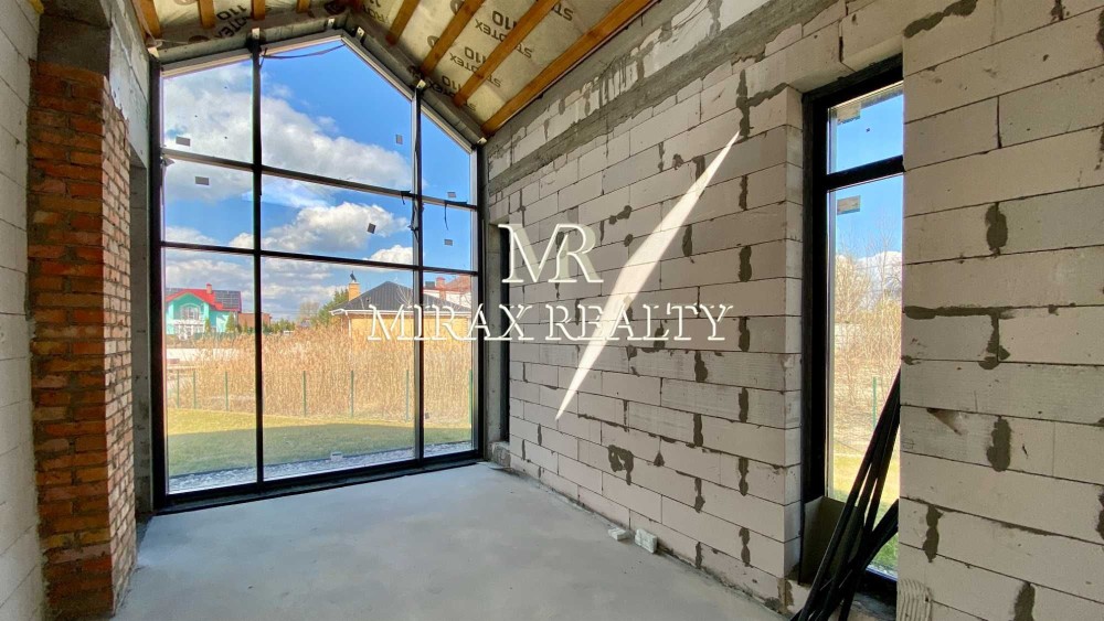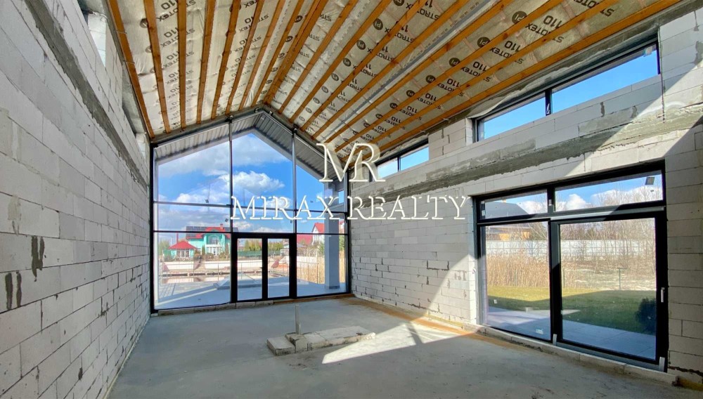 Будинок виконаний із якісних, сучасних матеріалів. Фундамент – стрічковий, утеплений, глибина 2200 мм. Стіни – газоблок 300мм, утеплений базальтовою ватою 100мм, оздоблені декоративною штукатуркою, частково фальцевими панелями. Перекриття – моноліт. Покрівля скатна – фальцеві панелі, плоска – гідроізоляційна ПВХ мембрана, утеплювач 300мм. Підлога - залізобетонна монолітна плита, утеплювач 150мм, водяна тепла підлога (санвузли, вітальня, кухня, камінний зал, прохід в кімнати), стяжка 100мм посилена арматурною сіткою. Вікна – панорамні, енергозберігаючі із двокамерними склопакетами, заповненими інертним газом аргон. У проекті передбачена можливість встановлення припливно-витяжної вентиляції з рекуперацією енергії, опціонально з функціями обігріву, охолодження та фільтрації повітря.