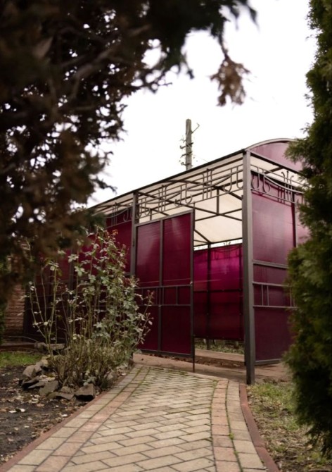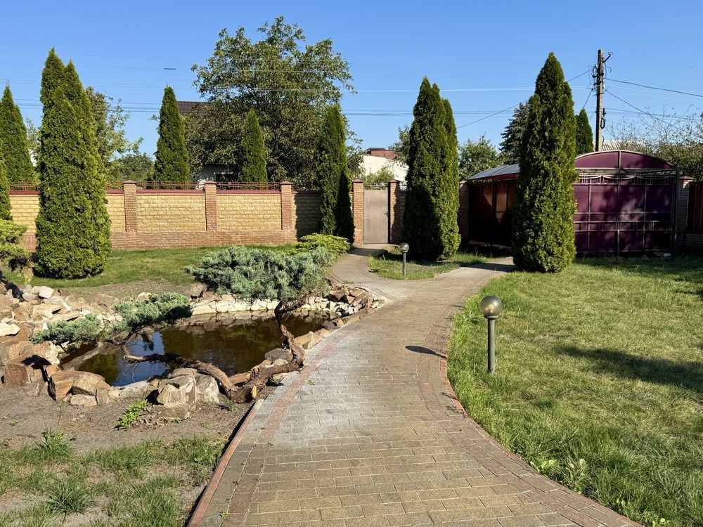 Ландшафтний дизайн з туями, декоративними деревами, ставком. Криша альтанка, навіс для авто, гараж, мангальна зона.