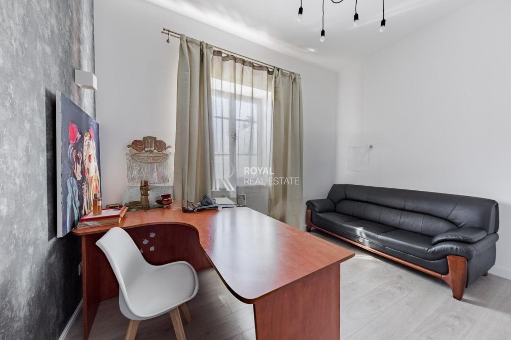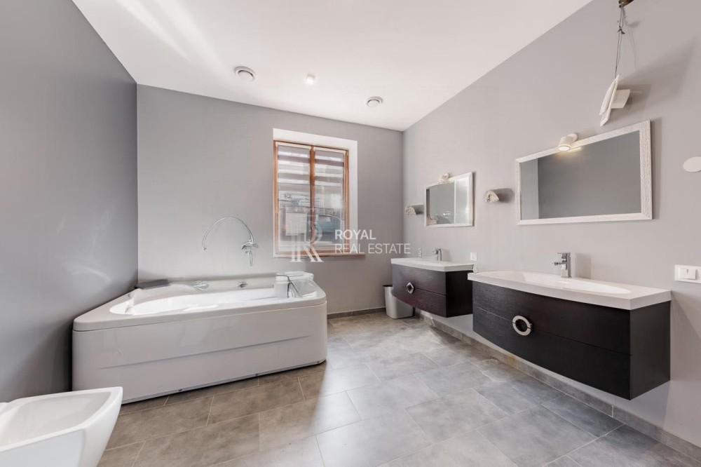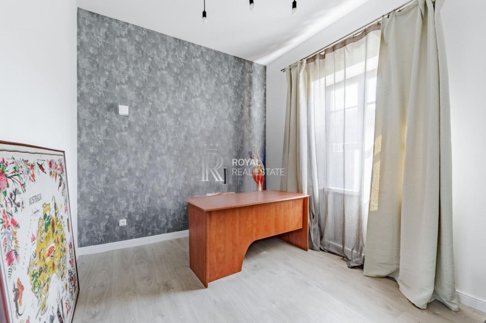 — Планування: простора вітальня з каміном і виходом на терасу, окремий кабінет, гардеробні, комори, пральня