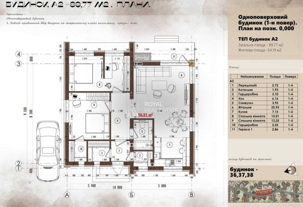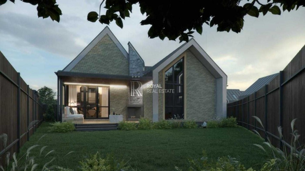 Побудований котедж з усіма зовнішніми роботами, встановленими дверима та вікнами (без внутрішніх робіт), земельна ділянка та паркомісце.