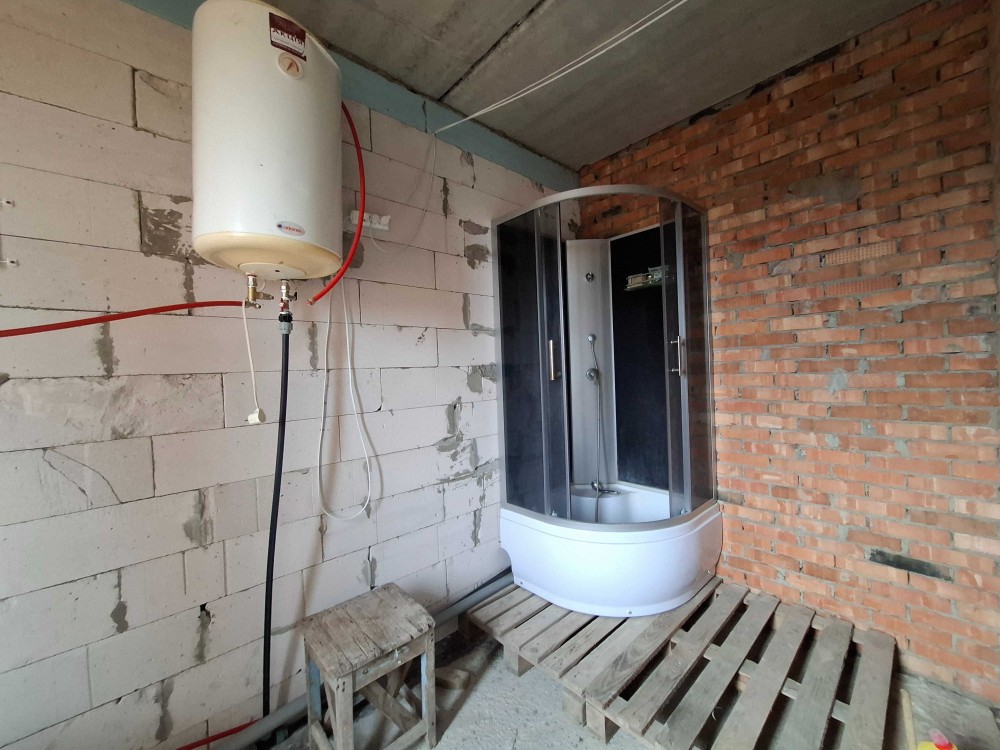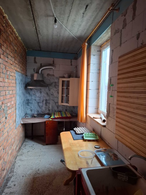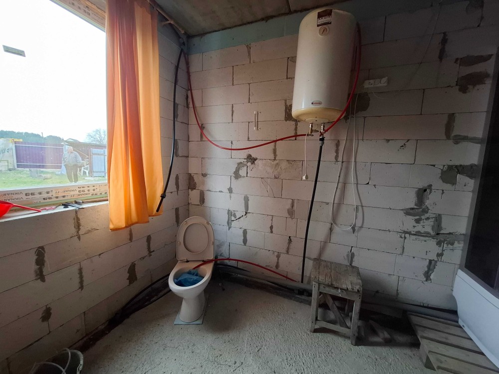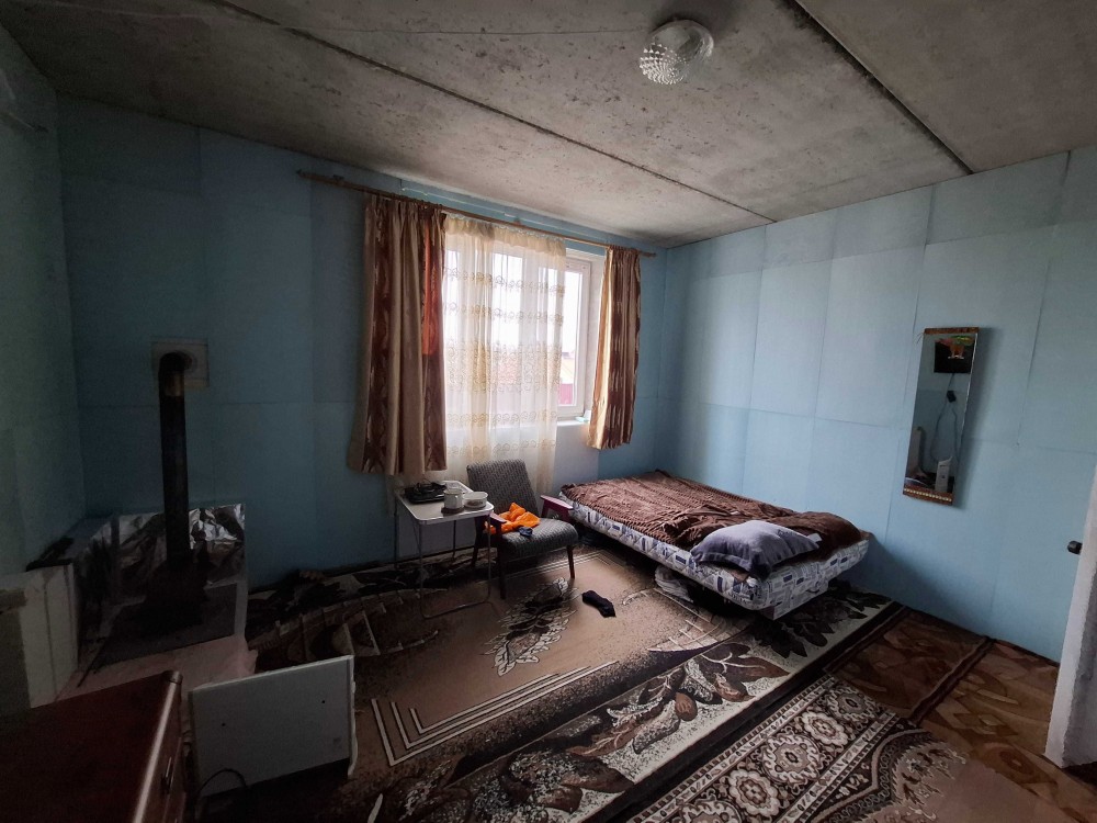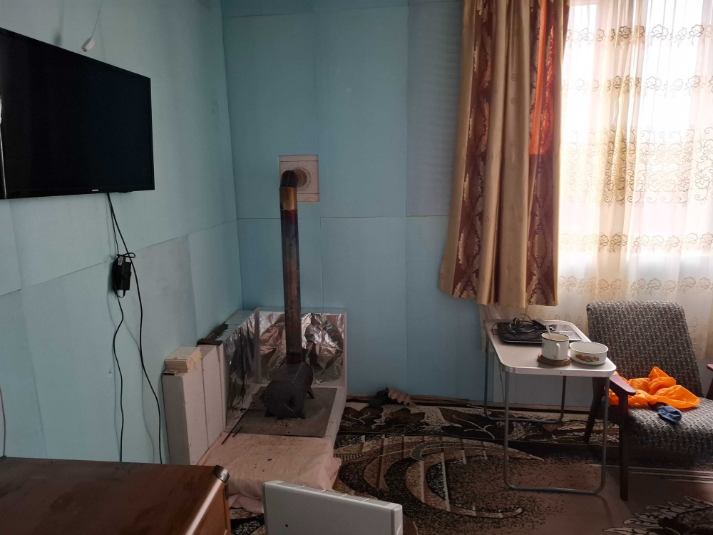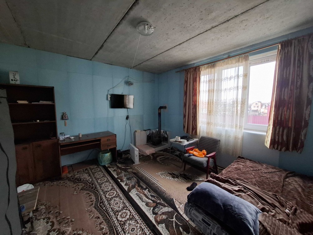 Одна кімната з буржуйкою , кухня, та діючий санвузол з гарячою водою дозволяють тимчасово проживати майстрам , поки робитиметься ремонт.