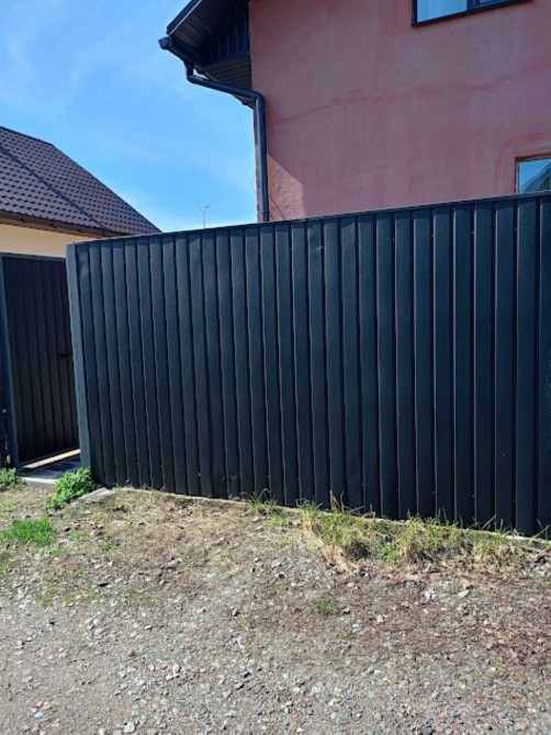 - капітальний паркан із металопрофілю з відкатними воротами для авто