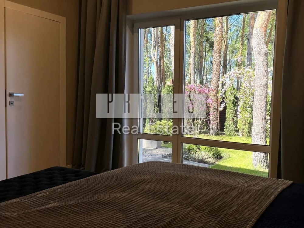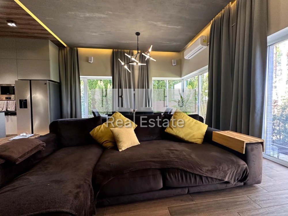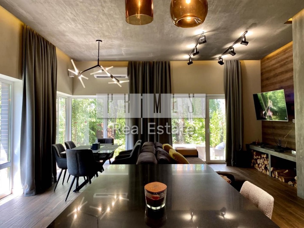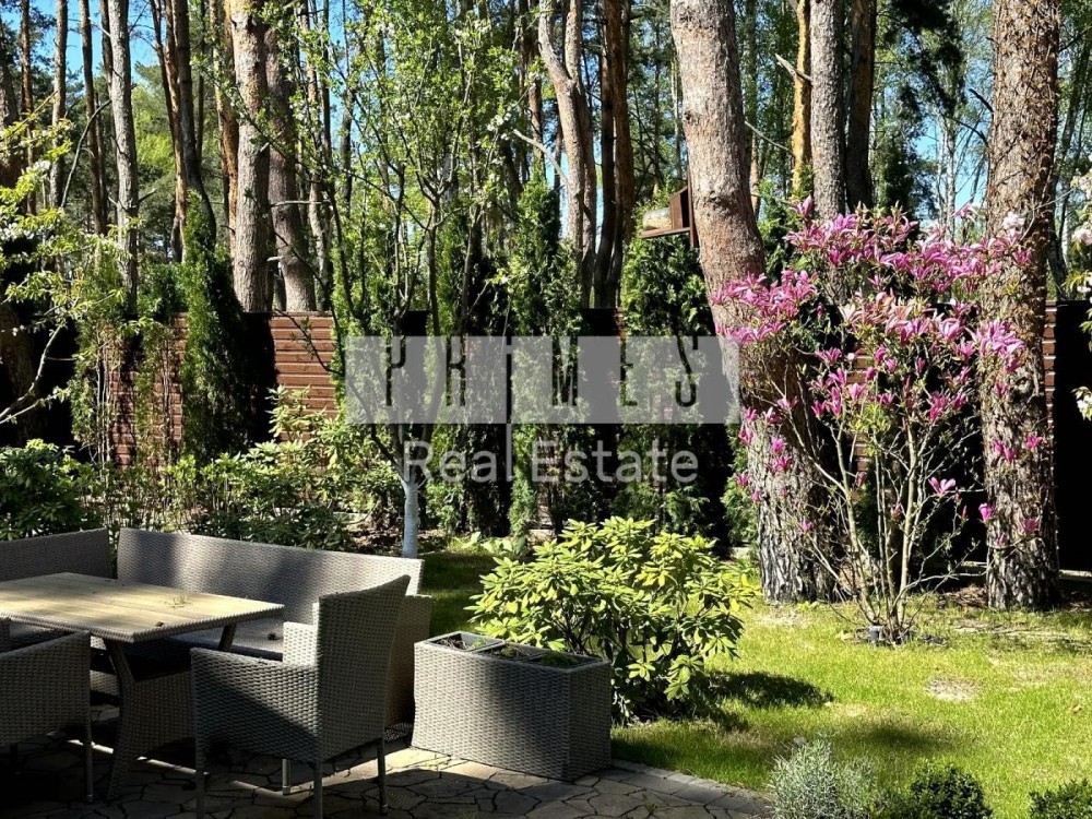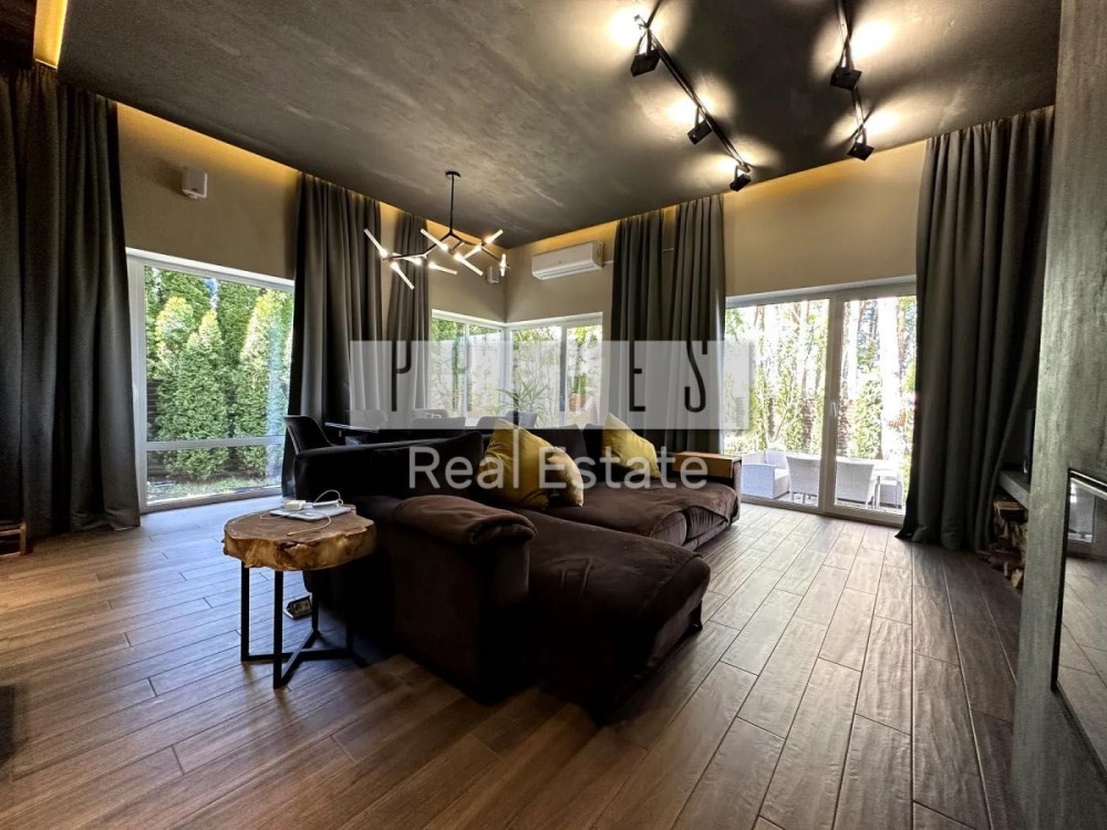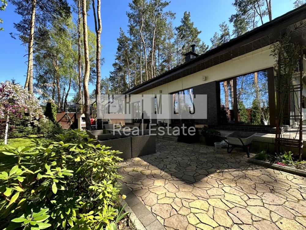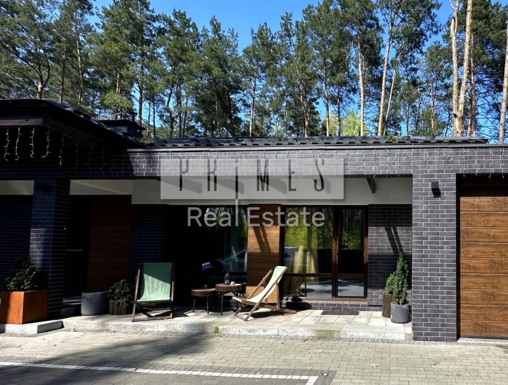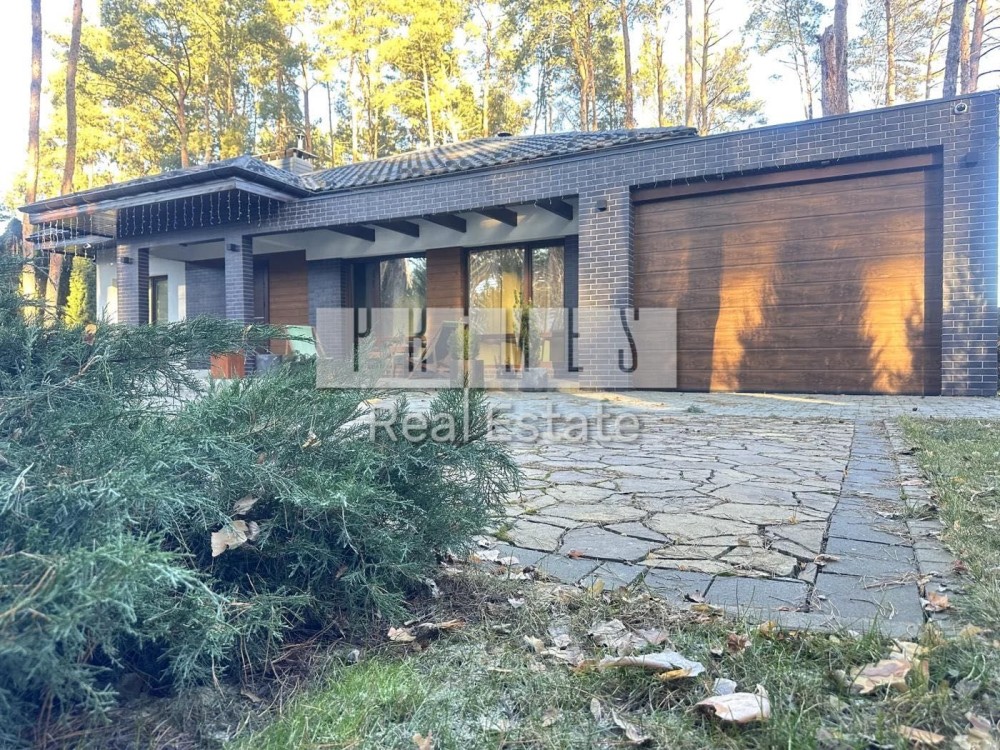 Цей одноповерховий будинок (135 м² гараж) розташований на великій ділянці в 8,5 соток серед хвойних дерев, з якісним ландшафтним дизайном, автоматичним поливом, панорамними окнами, террасою та зоною барбекю.