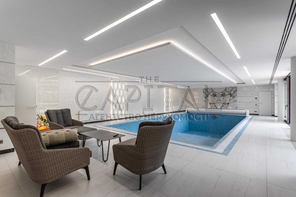 На першому поверсі будинку розташовані: передпокій, вбиральня, гостьова спальня, кухня-вітальня із виходом на літню криту терасу, окрема кухня, критий басейн з підігрівом та противотоком. Приміщення з басейном відкривається з можливістю відпочинку на літній терасі біля басейну з лежаками та парасолями.