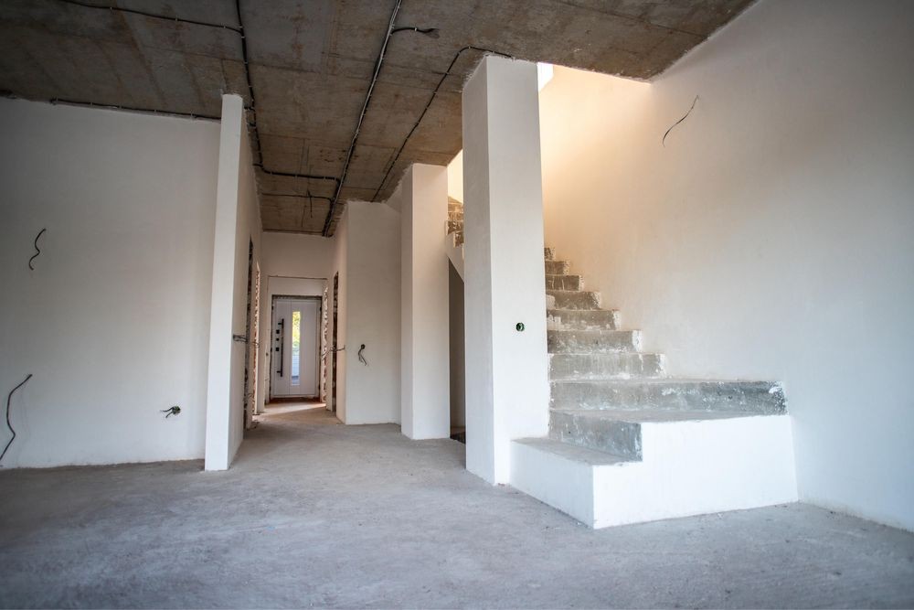 виконано всі чорнові роботи, розведено електрику, вапняна штукатурка ,