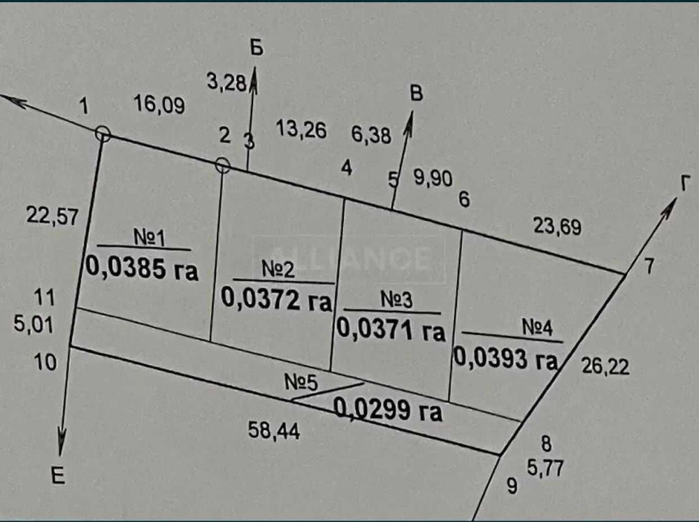 Земельна ділянка загальної площі 15 сотих, розподілена по 4 сотих на кожний будинок і 3 сотих- загального користування.