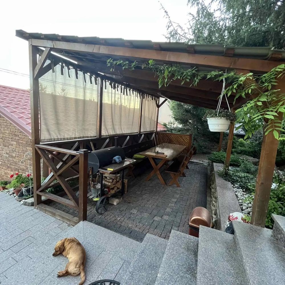 Є дві альтанки, мангал, дроварка, теплий будиночок для тварин (собак).