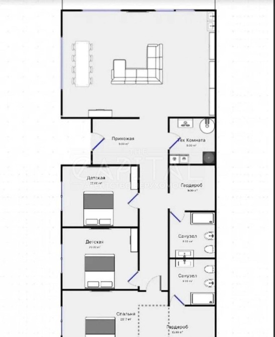 - три просторі спальні кімнати площею по 20 квадратних метрів кожна