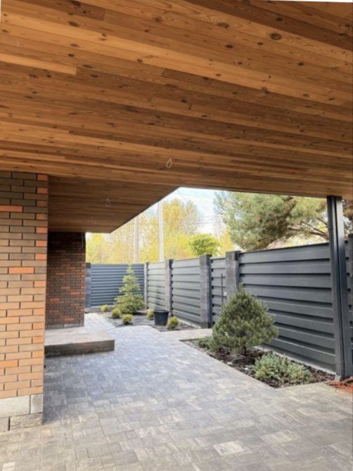 Власна территорія - 6 соток. Асфальтований підʼїзд. На території вже виконано мінімалістичний ландшафтний дизайн, постелено газон із автополивом, висаджені сосни та інші кущові рослини. Територія має власну огорожу із автоматичними воротами . Є навіс, виконаний з термодошки, для двох машин!