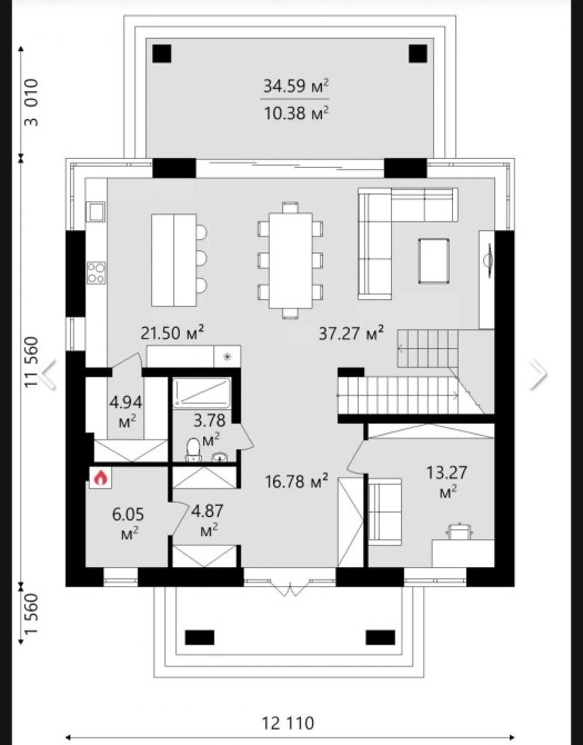 1 поверх: камінна зала, кухня-студія, спальня, санвузол, гардероб, тераса, котельня