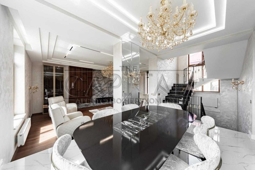 Перший поверх - хол, кухня AYAX (кварц натуральний),техніка Miele, їдальня (меблі NE STANDART та GABBA), камінна зала (електричний камін) з меблями BLANCHE, санвузол, тераса.