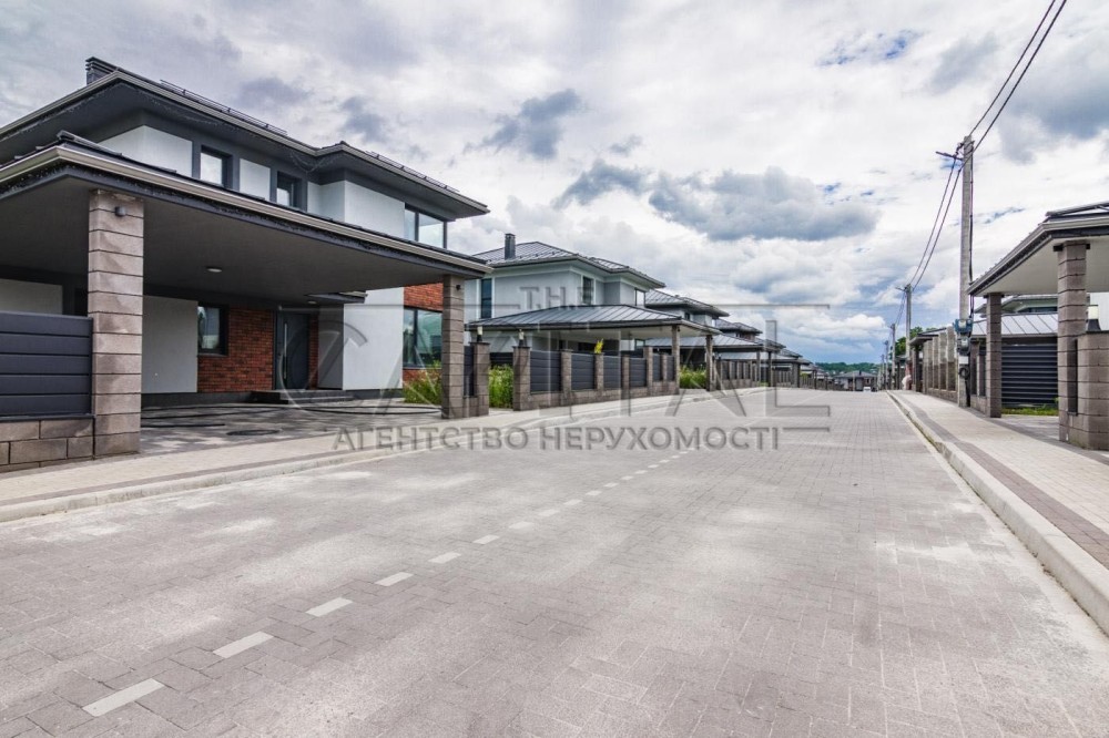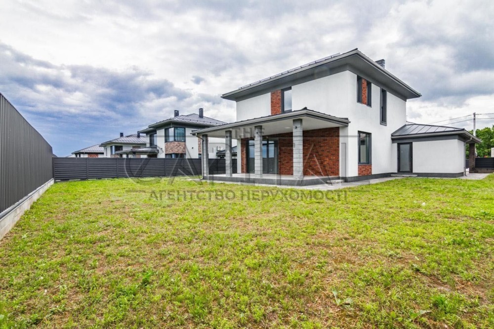 Двоповерховий будинок на 7 сотках у затишному котеджному містечку. Тераса, навіс для авто, панорамні вікна з видом на ліс.
