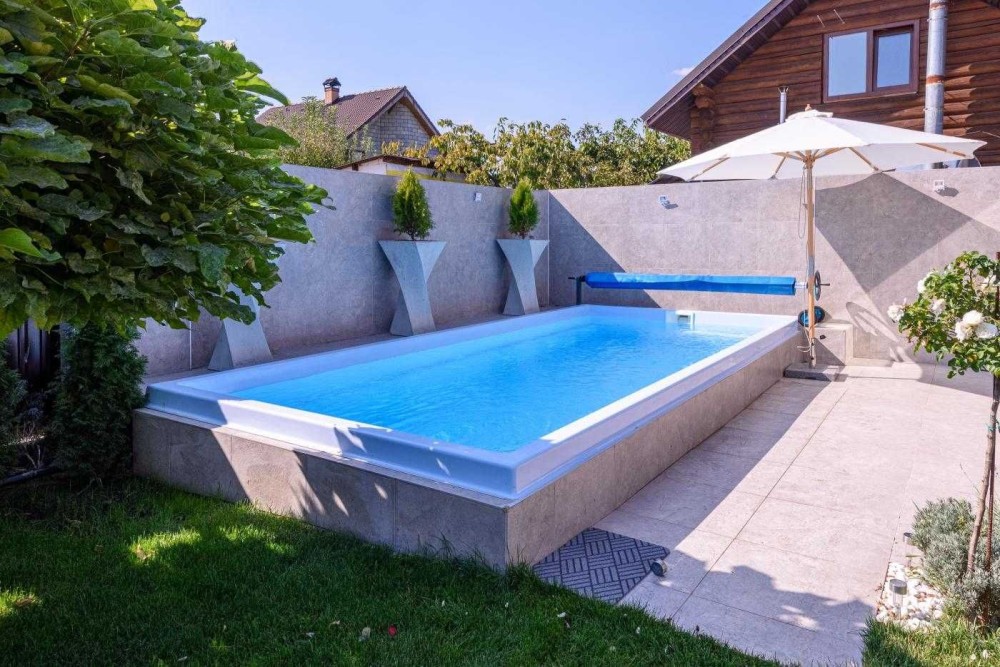 Основна будівля оточена озелененим двором на ділянці 10 соток, де ви знайдете гостьовий будиночок із сауною та басейном з підігрівом. Гостьовий будинок ідеально підходить для прийому гостей: тут є простора кімната відпочинку, вітальня, санвузол та душ.