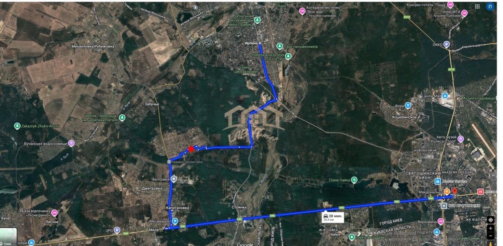 До центру Ірпеня 9 км , до Києва м.Житомирська 35 хвилин на авто.