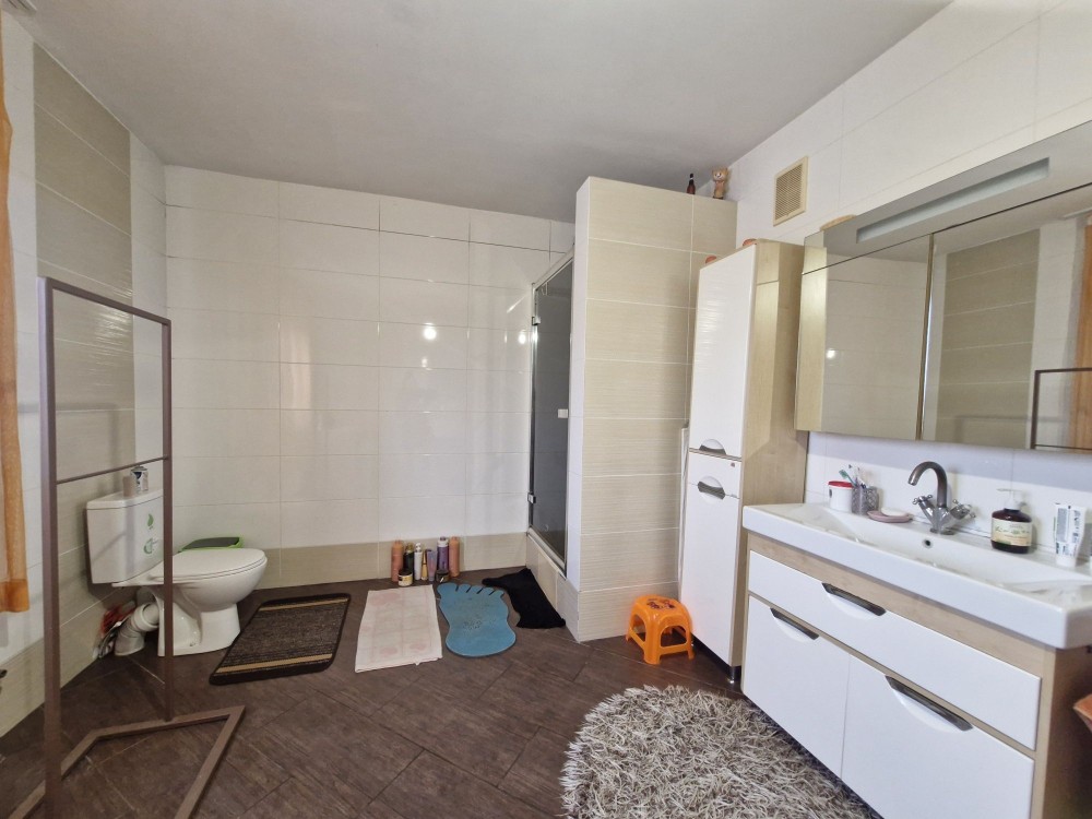 По комунікаціях все зроблено з запасом: 10 кВт світла, три фази, три санвузли. Опалення — і газове, і твердопаливне. Є можливість підключати резервне живлення, все вже підготовлено. По будинку зроблена водяна тепла підлога.