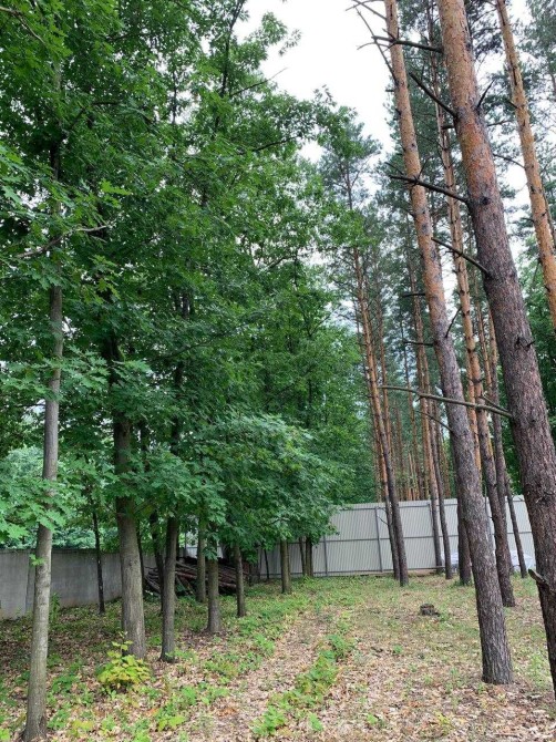 На участке много деревьев: сосны, дубы.