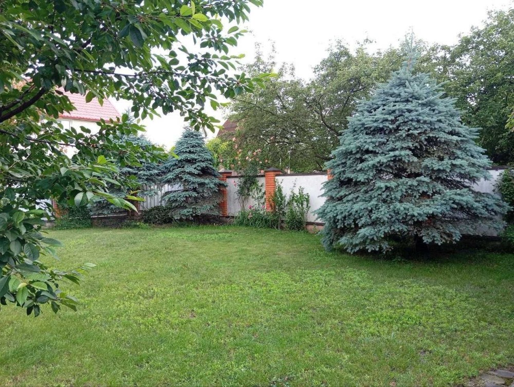 Газон, дорослі дерева, блакитні ялинки, сад (плодоносний-персики, абрикоси, вишні, яблуня), розарій.