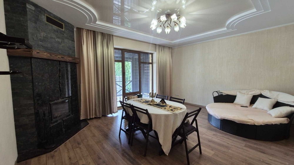 • ​1-й поверх: Кухня (12.3 м²), вітальня з каміном та виходом на терасу, кабінет, санвузол з душовою.