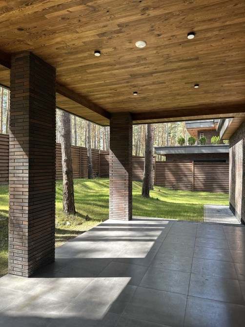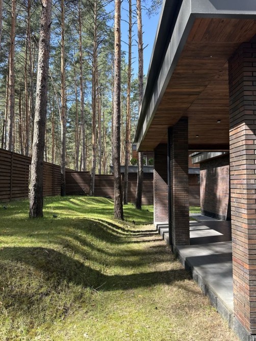 Будинок розташований на ділянці 6 соток із доглянутим газоном та високими соснами.
